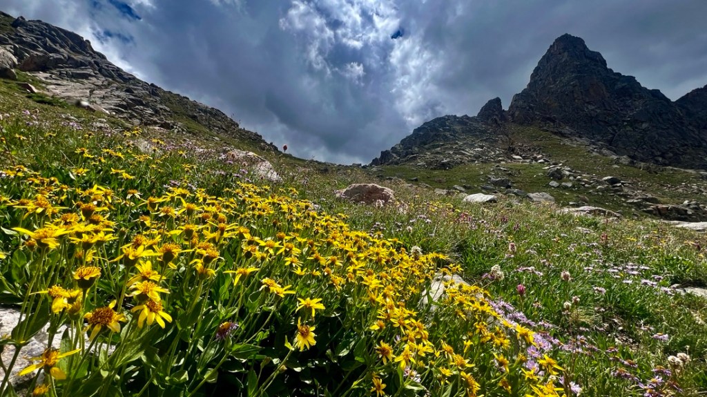 August is afternoon-storm season with extra care required above tree line. Our campsite just below Elliott’s Ridge was very exposed but the forecasts looked OK. The CMC trip suggests camping at lakes that are a little lower. We were lucky with the weather and started our hike just after some bad storms. On the first day, we passed a couple that were hiking out from Surprise Lake, with what looked like new gear suggesting novice campers, and residual fear on their faces from the previous night’s storms.