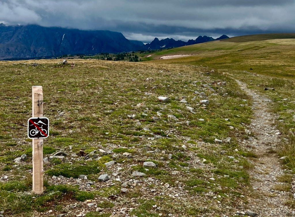 We passed through the wilderness area boundary marked by a no cycling sign and arrived at the trailhead shortly before the rain started. It seemed heavy so we put on full waterproofs, waited for it to subside a bit and headed on.