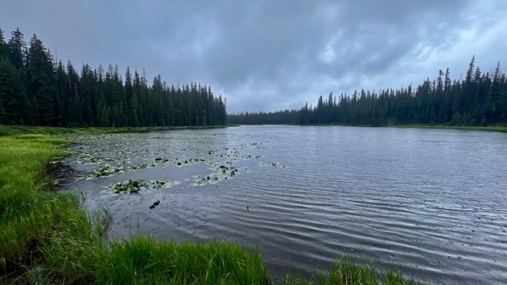 As we arrived at the lake, we saw one other tent though no sign of the people who were likely hunkered down inside. We followed the trail down to the far side of the lake looking for optimum campsites and found one after a while.