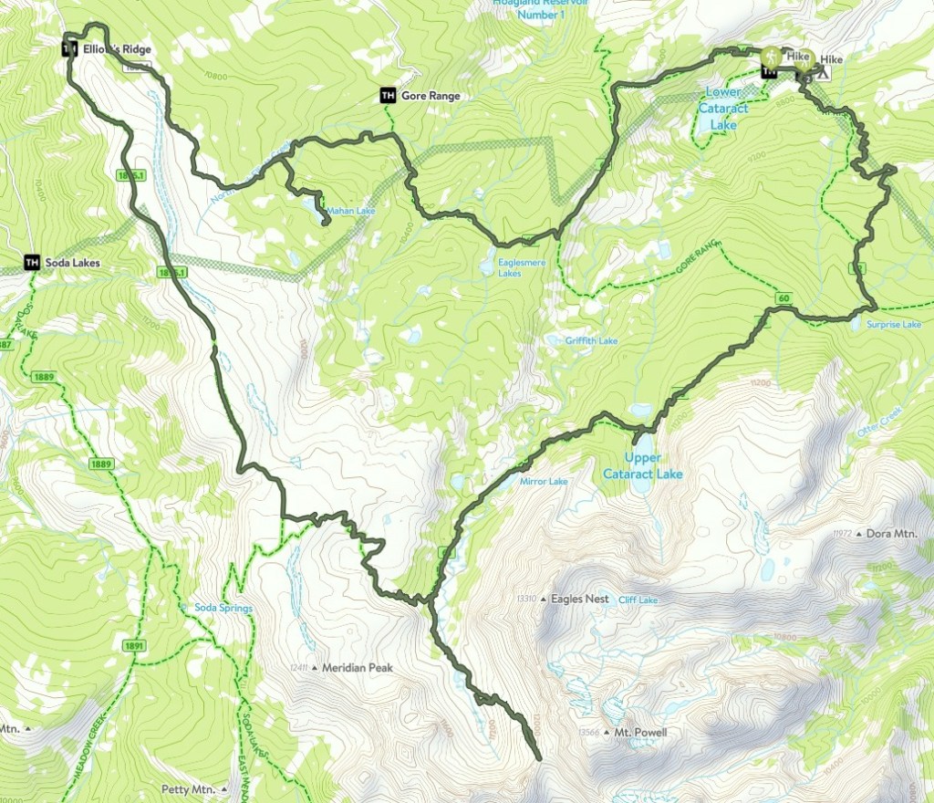 The only loop that jumped out at me was from Lower Cataract Lake to Elliott’s Ridge, via Upper Cataract Lake and back via Mahan or Eaglesmere Lakes. I was surprised that I could not find an account of the loop, which also made me a little cautious. The Colorado Mountain Club (CMC) describes a similar 3-day loop covering 20.5 miles from the Elliott Ridge TH, and that is a robust alternative that follows much of what we hiked, and increased my confidence in our route.