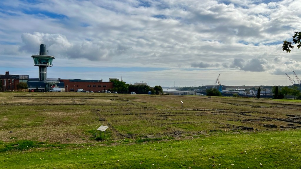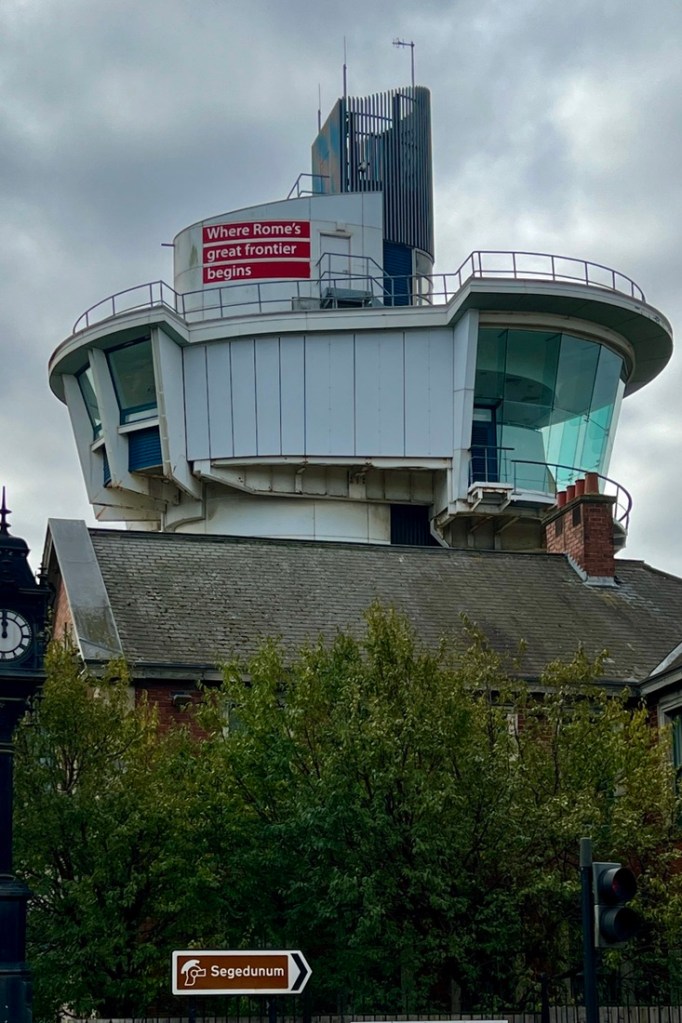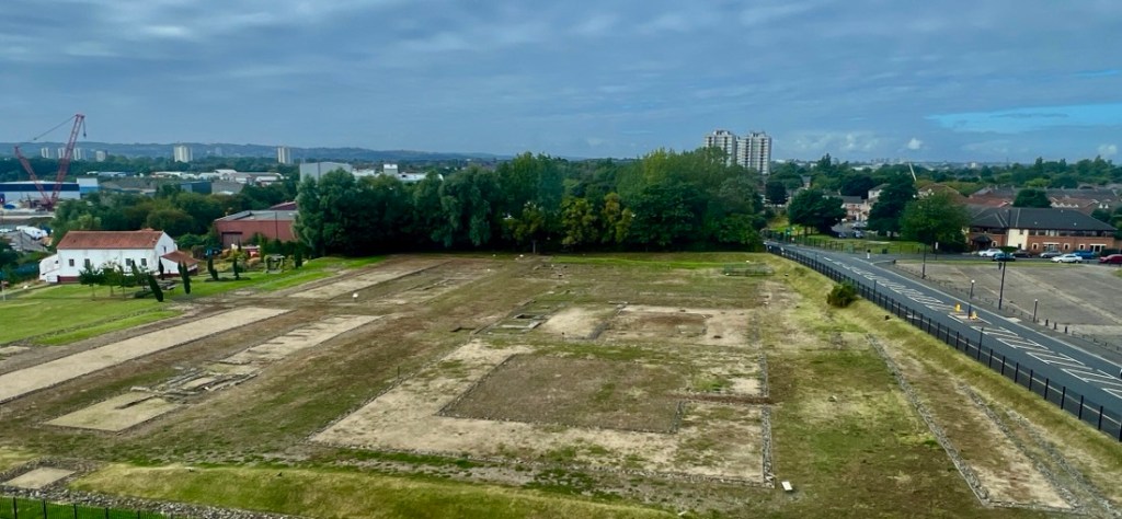 The Segedunum visitor’s centre had just opened when we arrived a bit before 10. We stamped our HW passports, bought a T-shirt (so now we have to walk it) and paid to enter the museum. The view from the 9th floor over the remains of the fort and the shipyard were the highlight. They had a simulated Timelapse video of what had happened to the fort, and how buildings and roads had been built over it before an archeological dig in 1997. The area had been part of the very large Swan Hunter shipyard which is no more. The museum had lots of artifacts. Walking the grounds, there was the outline of what used to be there, but we needed to walk to the other side to get our first glimpse of the real wall alongside a reconstruction of what the wall would have looked at.