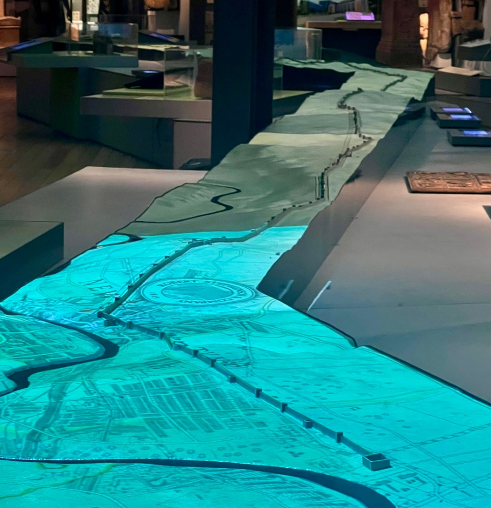 We walked under all of the bridges before heading away from the river to our hotel, to shorten tomorrow’s walk when we will rejoin the path where we left it. This made today’s walk from Segedunum a bit less than 7 miles taking a little over 2.5 hrs, not including a stop for a sandwich. After a short rest, we headed off to the Great North museum which has a model of the whole wall. This was an interesting walk seeing other aspects of Newcastle, passing through China Town, past the Eldon Square shopping centre, and along the edge of Newcastle University.