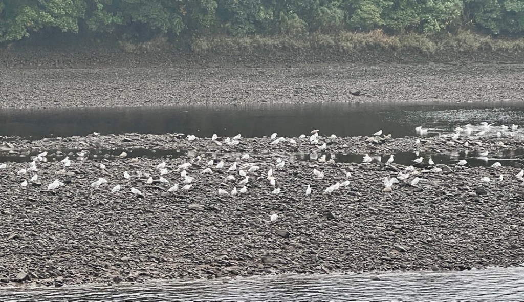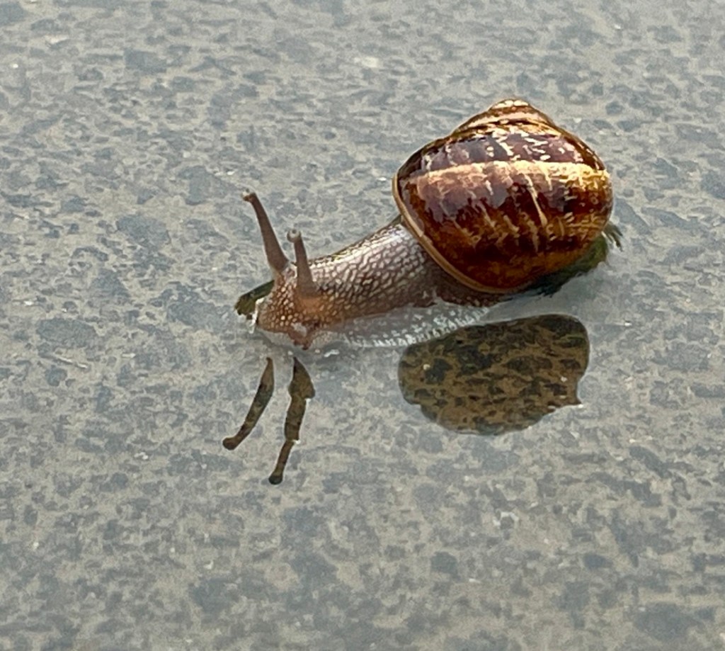 The river changed with the trail, and the curlews looking for a meal in the mudflats evolved to a flock of seagulls hanging out on a rocky island. While the couple of rats that we saw hinted at the industrial past of the area, we enjoyed some slugs and snails that thrived in the rain.