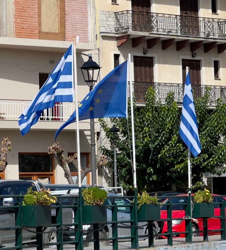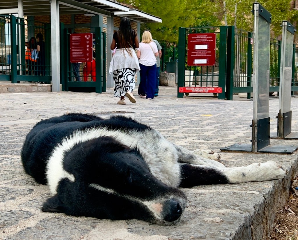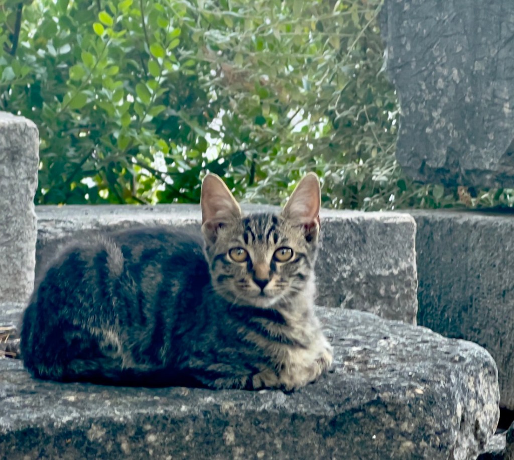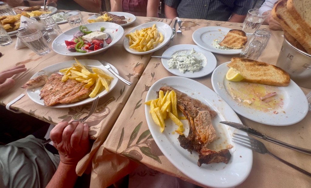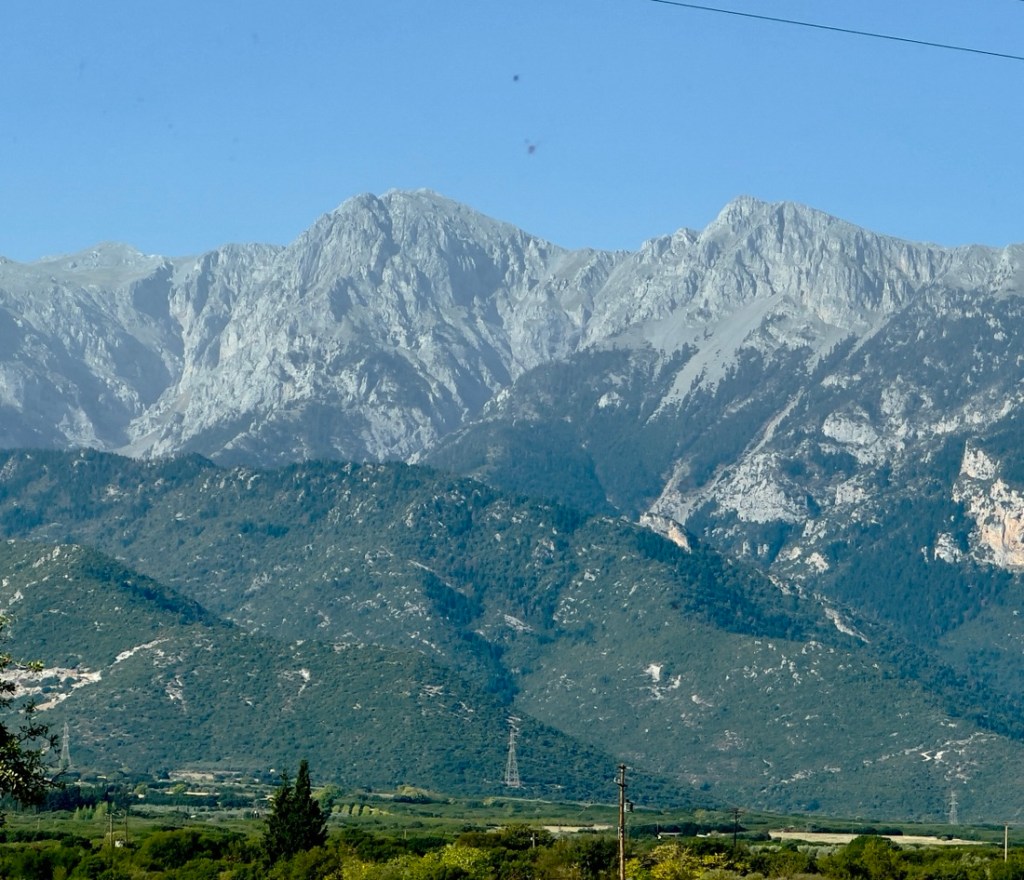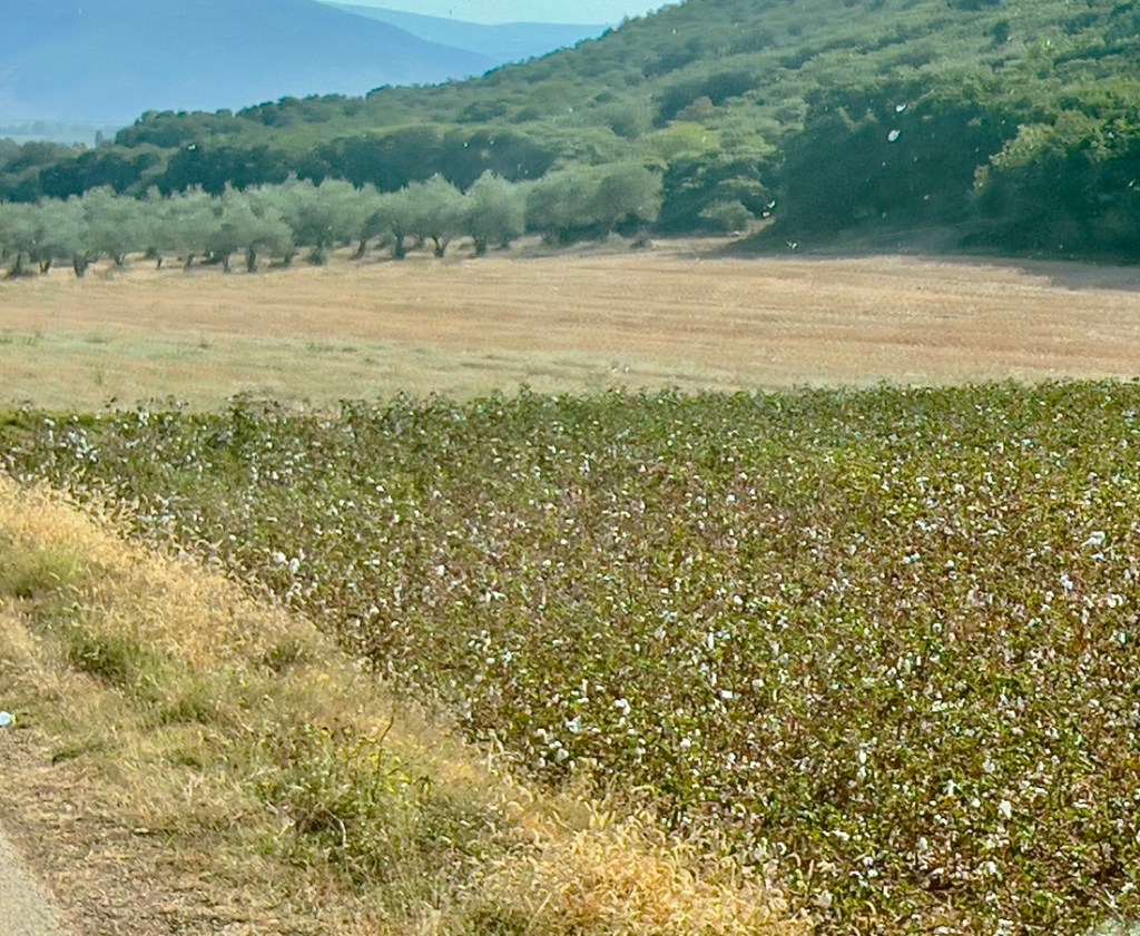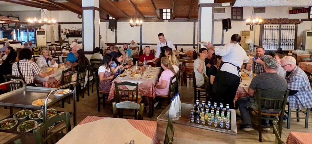 The night before and after the Delphi visit, we stayed at the Mitsis Galini hotel in Kamena Vourla. The town is on the coast with some natural hot springs and used to be one of the most popular Greek destinations. It has been superseded in tourist popularity by Greek islands such as Santorini and Mikonos. The hotel felt a bit old and tired but it served us well and the staff were very friendly. It had a lovely pool, which was a bit chilly, but it was great for swimming and I was very happy that my shoulders worked well! We are traveling around by bus which is comfortable and has plenty of room as our group size is less than thirty. On our way to the hotel yesterday from Athens, we had stopped for a huge lunch, which was an insight into a continual flow of large volumes of food! But we continue to enjoy the cats 😁. We also had great views on the way into the mountains today, though were a bit surprised to find cotton growing alongside the olives.