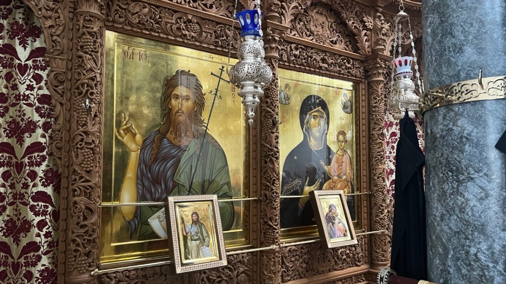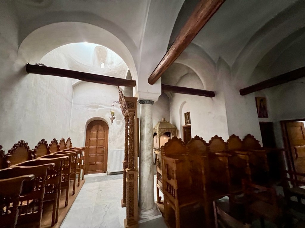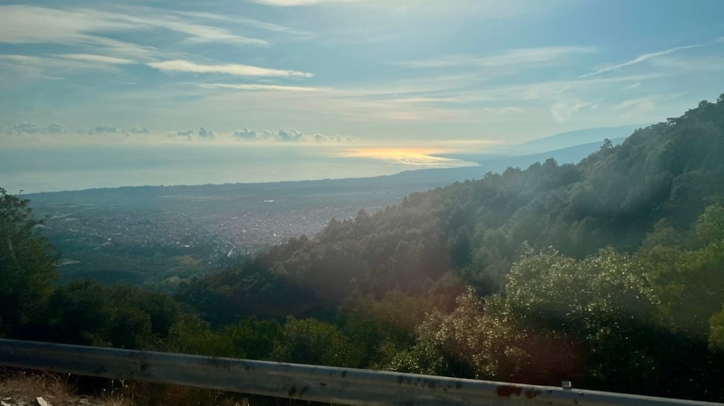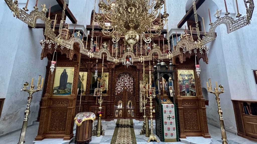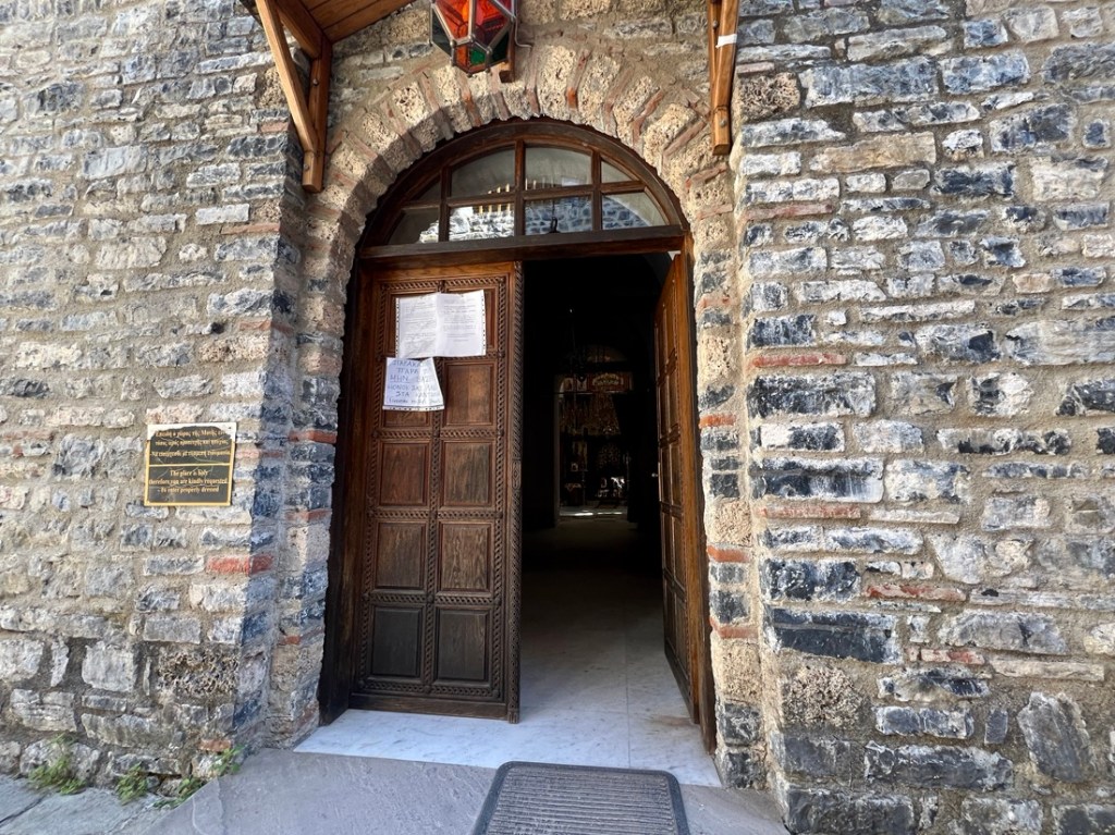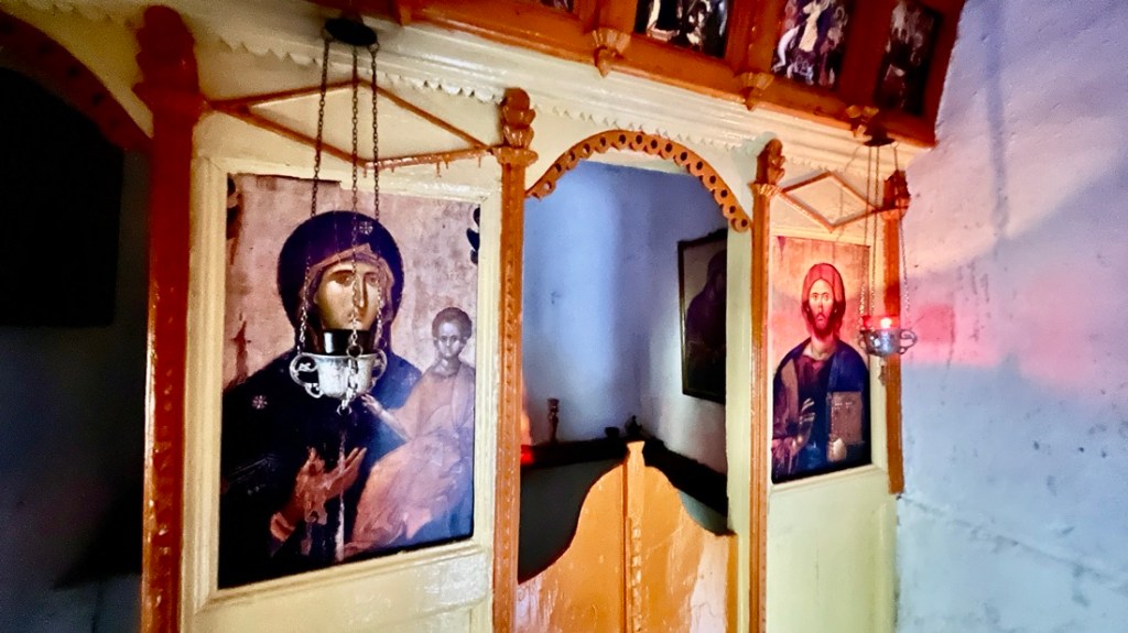We were promised some Hiking on Mt Olympus so I was excited. The mountain was the traditional home of the twelve ancient gods of Greece, led by Zeus. The mountain is often shrouded in clouds or shaken by violent thunderstorms, which helped propagate the legend of the gods. Our coach drove as far as it could up Mount Olympus and then we walked about 1/2 mile down a road with hairpin bends to a monastery that was started by Saint Dionysius in the 16th century. It was destroyed by the Nazis in 1943. A new “branch” of the monastery was built further down the hill, and this new one is partially renovated and repaired. It was a peaceful visit, and its intermediate state of repair made it feel more authentic. While the church had plenty of icons, it felt less gaudy than the other churches we have visited. However, what was truly unique about this church was its lack of cats!!