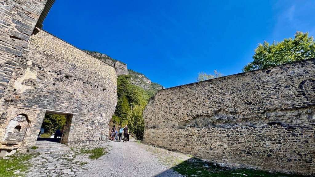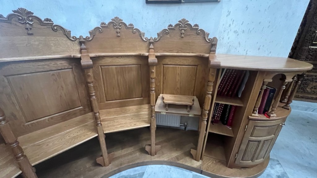 The view back down the mountain as we drove up. The bus climbed to about 3200 ft, less than half the height of the highest peak which is at 9573 ft.This way!!On a hairpin bend was this chapel, commemorating someone who died here. In the valley below were the remnants of a precious chapel. Oh dear!The monastery’s living quarters were partially repaired after the 1943 destruction by the Nazis.It appeared that the church had been restored first.Inside the monastery, Dr Laird explained Nominus Sacra, the use of two letters in the corner of a document, usually the first and last initial of a sacred entity. He is standing in front of a door that only the priest can enter. To his left is an icon of Jesus, in its traditional place.To the right of the priest’s door is the traditional location of an icon of Mary holding Jesus. Next to that is the Saint that the church is dedicated to. In this case, it is John the Baptist.The center of the church was quite ornate.The pews have a movable seat that allows you to sit or stand.The entrance to the church was simpler. Perhaps it had not been restored. This appealed to me more.The entrance to the church.Some of the outer walls remained in disrepair.I could not find a good explanation as to why these pipes stuck out of the wall.