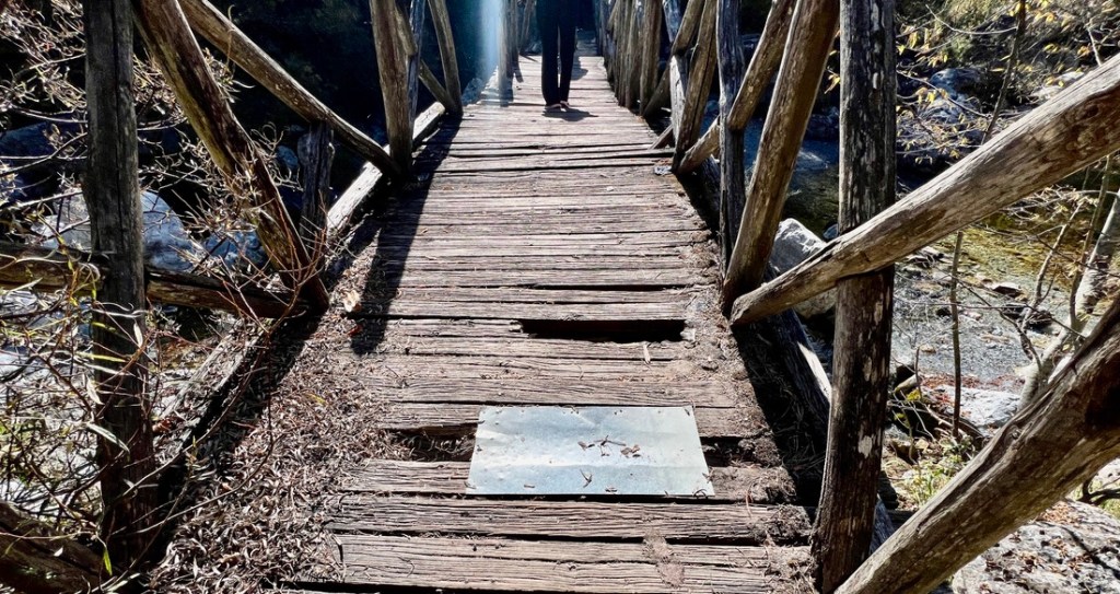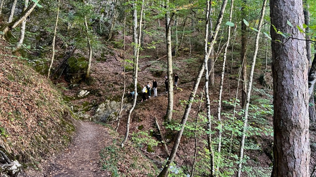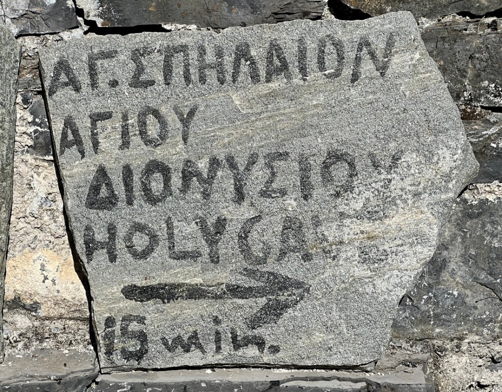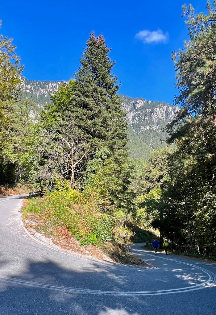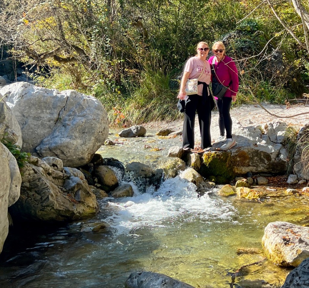 This way to the cave! It took us a bit more than 15 minutes.Hiking down.This trail was part of the European Trail E4, but some bridges were damaged. The E4 trail is over 6,000 miles long and travels from southern Spain to Crete. It would be most disappointing to have walked this far from Spain to find the path closed!!We had to cross this holey bridge. It was a bit wobbly! I rock-hopped across the river on our return to avoid it 😁.Railings?The river was pretty and made such a peaceful noise.Onward to the cave, through woodland and landscape that reminded us of England.You need to go down before going back up!We arrived! The church was built in the shelter of a natural cave. I can’t imagine how long it took Dionysius to find this location!Selfie-worthy. The main church was directly behind us. The lean-to in front of that was a prayer room . Behind the church was a natural spring.The tiny church resembled the structure of bigger churches, with the central door to the back room, and icons of Jesus and Mary on each side.This icon had a candelabra in front of it to keep it lit.Water coming out of the rocks at the back of the cave behind the church.On our way out, we noticed this small memorial chapel by a path that led down to a waterfall in the river. Be careful!The brave people among us took the bridge back. I was more comfortable rock hopping!The girls enjoying the water and contemplating a dip, not…On our hike out along this road, I noticed this view of the mountains looking down on us.This rock had fallen on the road. Red exclamation marks had been painted on it to warn drivers, but were very faded.I’m unsure whether this crash barrier worked!