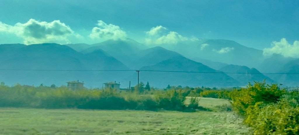 Happy people.The gyro. Maryanne taught us how to say it, and the closest I can write it is “year-o”. I need at least one gyro each year. The term “gyro” comes from the rotating stand that the meat is cooked on, using the same route word as “gyroscope.”Our lunch restaurant.Our restaurant. It was a hole in the wall! Mount Olympus looked down upon us as we looked for our next stop.Our next stop was a fine coffee shop with many yummy sweets and ice cream. I chose the tiramisu. I chose well 😃.I was also happy that they served a “flat white” coffee, my favorite, which is common in UK but rare in the US, for some reason that I have not found yet!On the way to our next stop in Larissa, we drove with this view of Mount Olympus, with the afternoon clouds gathering.