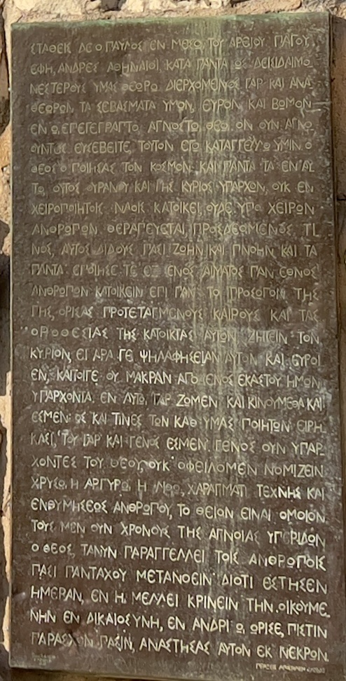 The current size and importance of Athens does not align with Paul’s Athens, and Acts 17:16-34 describes his visit. The Bible does not include any other mention of Athens. Its military losses had reduced its political power but Rome promoted it as an educational city of learning. This encouraged intelligent discussions, and Paul eagerly arrived in this environment. We visited the two sites that Paul visited in Luke’s account of his visit.