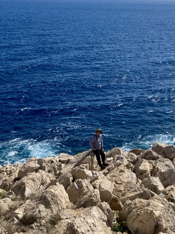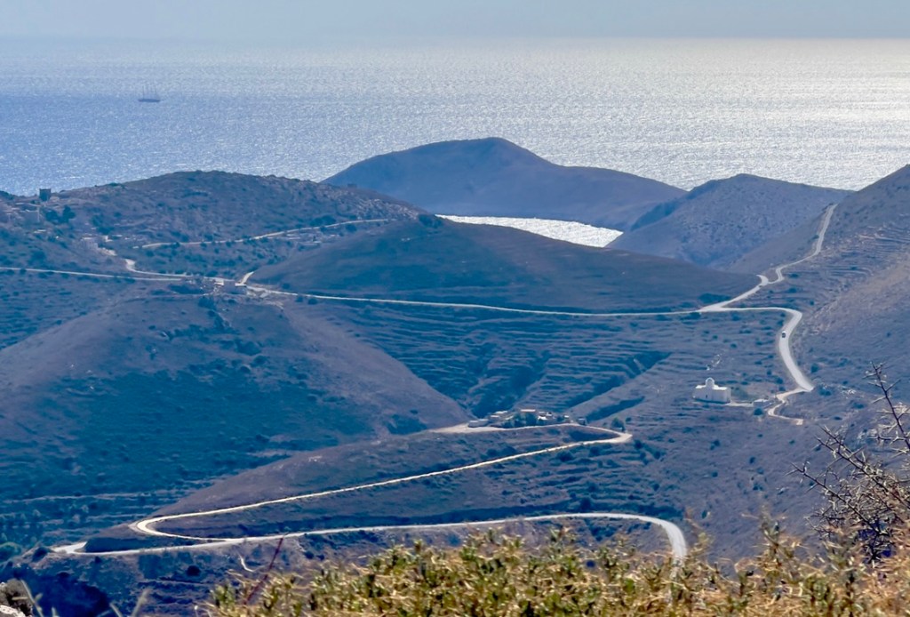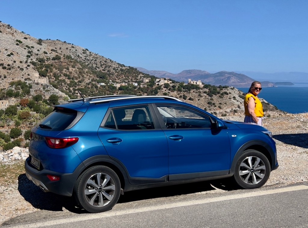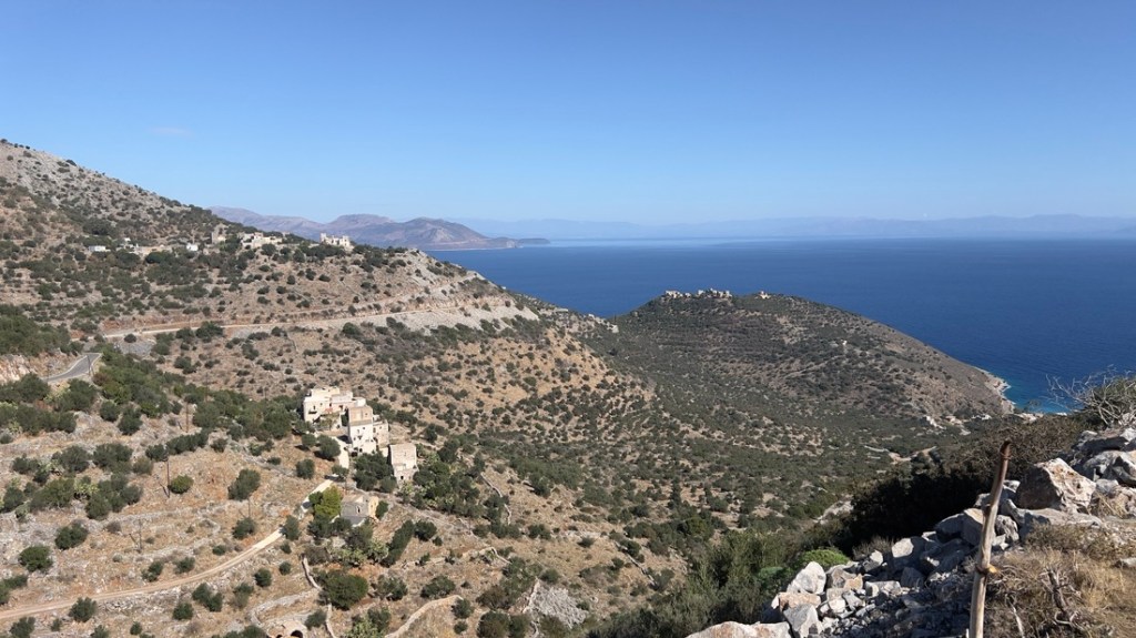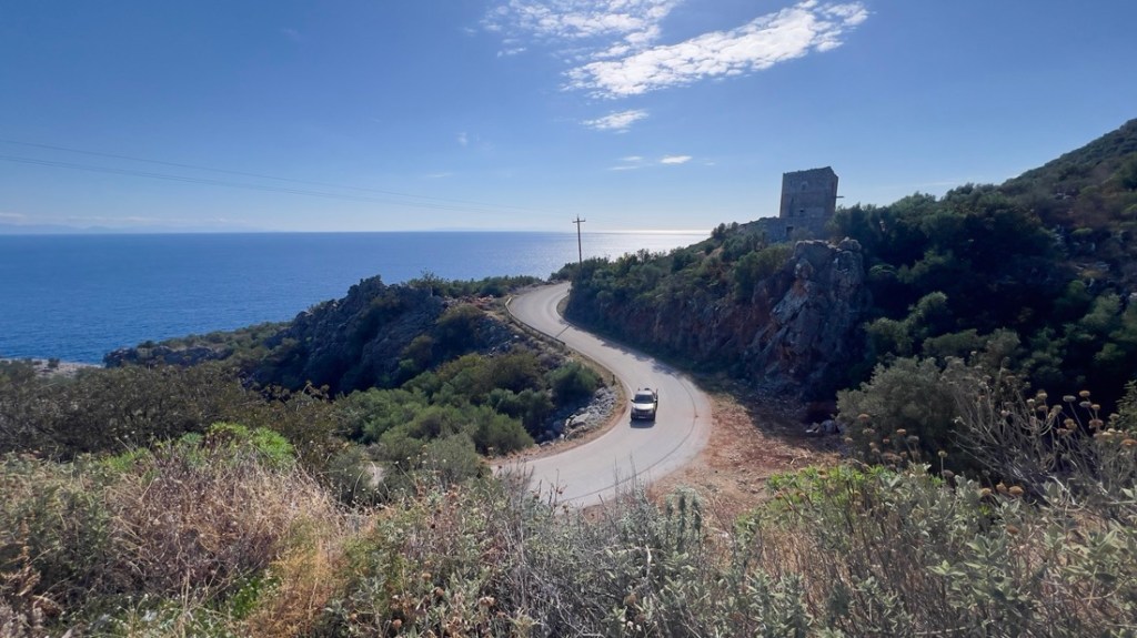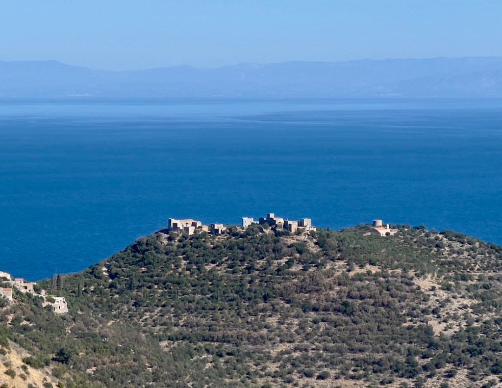 The drive along the Mani Peninsula, which leads to the lighthouse, was an adventure in itself. We crawled around hairpin bends, sensing that if we went straight instead, we’d land in the perfectly blue sea. In the sixth century, pirates drove the inhabitants into the hills, and they only came back to the coast around 1800. Many of the small castles that they built in the hills remain, and modern buildings mimic the architecture. We found cows roaming along the road, flanked by abandoned terraces which hints at previous farming. The Mani are known as the toughest Greeks and the 1821 fight for independence started here, as the Ottomans were never able to conquer the inhabitants. The stark beauty reminded me of the Lake District, without the rain!
