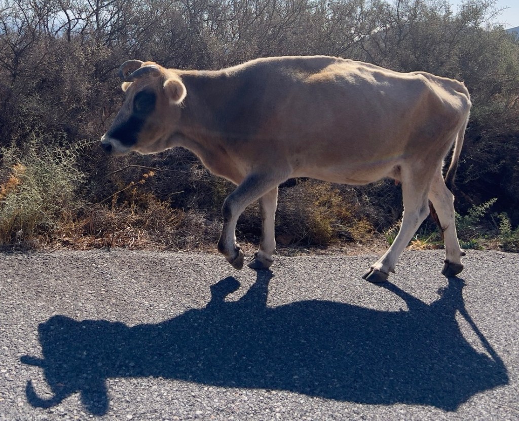 An interesting bridge, only wide enough for one car at a time.The abandoned Dimitrios shipwreck which ran aground in a 1981 storm.Typical road and scenery.Some old and new castles on the hill top.Dramatic scenery.Our car was perfect. There were several RVs and the road was barely wide enough for them when it passed through villages.Old farming terraces.A cow and an accidentally perfect shadow. When we first saw three skinny cows, I thought of Joseph’s dreams. The environment seemed so unsuitable for cows to thrive.These baby cows were so cute! The end of the world is in sight!There was a fancy resort and a four masted schooner in this bay.At the end of the road, the sign said, “Sanctuary and Death Oracles of Poseidon Tenarios.” Tradition holds that an underwater cave off this point was the entrance to Hades, as this was the end of the world, as Greece was the world.Where the road ended, a path continued to a lighthouse at the southern tip. It was dry and rocky and 45 minutes each way, but worth it as the views were fantastic.Close to the trail was this random mosaic.The lighthouse!I crawled down in front of the lighthouse to find a geocache. It was a cool climb. especially when I found it.Greek Lands’ End!We spotted twenty ships off the point, where there is a major shipping lane.The peninsula to the end of the world.More old abandoned castles as we headed north.More great views.We reached our destination for the evening, Kardamyli. The town was small and quiet. The sea was a two minute walk from the hotel, and the water was surprisingly warm when I went for a swim. Some little fish nibbled me! This picture was the view from our hotel room.Close to the evening’s restaurant was this random sign. Walney is close to where we used to live in the Lake District in England! The mileage seems about right.