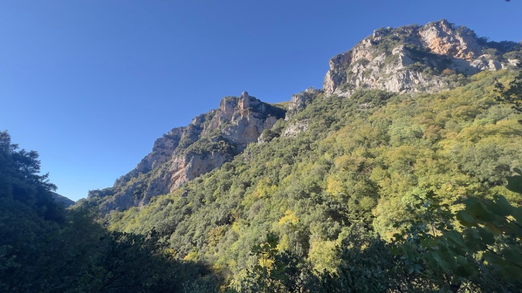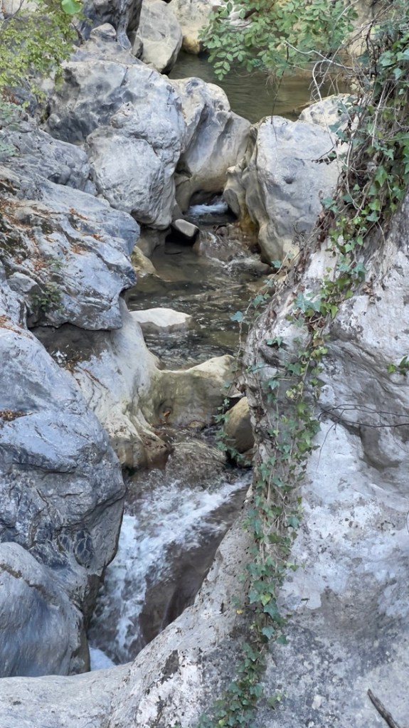 We continued toward the sound of the water and were soon at the bottom of the gorge, looking down on the Lousios, rushing past us below the bridge.