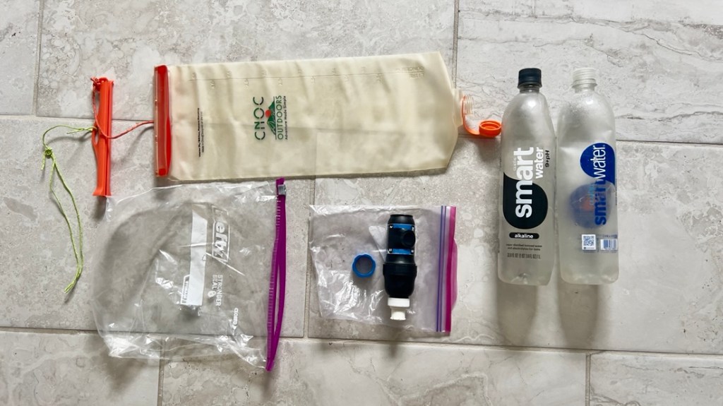 I bring two 1.3-ounce Smartwater bottles with my Sawyer squeeze. I have an easily-accessible bottle sleeve that attaches to the front of my backpack straps and lets me drink whenever I want. I started with a 7-ounce Nalgene and would only consider this for very cold nights when I’d use the Nalgene as a hot water bottle. I could leave the CNOC bag behind but I appreciate the extra storage. Water System (Bottles, Sawyer, backflush adapter, CNOC 3l bag) = 10.1 ounces.