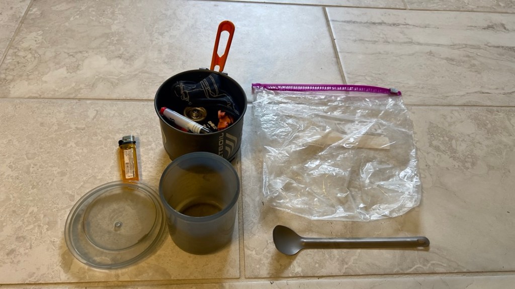 While the lightest cooking system is none at all, there are multiple options. I like the simplicity of gas and the efficiency/ease of Jetboil. I tried a BRS300T/PocketRocket with a titanium mug, but didn’t like the metal mug. I only boil water and eat food out of packaging, either the oatmeal packet or a ziplock bag. I upgraded my original 15-ounce Jetboil to the 8.8-ounce Jetboil stash. I’ve made the mistake of bringing too much gas and have learned a full 3.5 oz container is enough for 20 boils, supporting two people for a week. If I run out of gas, it’s not the end of the world, but I haven’t yet! It helps to get an adapter that allows you to consolidate gas from multiple containers. The weight of the gas is a consumable. Total Dry Weight (Stash, lighter, empty fuel canister) = 12.3 ounces.