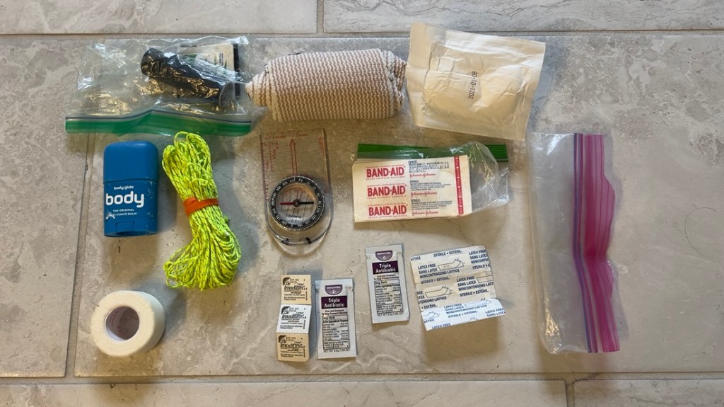I reserve this category for things that I will bring again, even if I don’t use, though I try to minimize. This includes a small supply of fixing tape/patches (0.3 ounce), thin rope (1.1 ounces), and the car key with some cash, credit cards, ID, and insurance card in a ziplock (1.9 ounces). I have created my own first aid kit based on the incidents I consider might happen to me and what I would use to help me self-rescue. This includes bandaids, Imodium, and a bandage. I treat Ibuprofen as part of the food! I started with a purchased kit and evolved to this one weighing 4.1 ounces, keeping it in a ziplock. Having wetwipes available to clean cuts helps justify them in my consumable category, using them as a “luxury” item when emergency needs don’t happen. Emergency items (Tape, rope, key and ID, first aid) = 7.4 ounces.