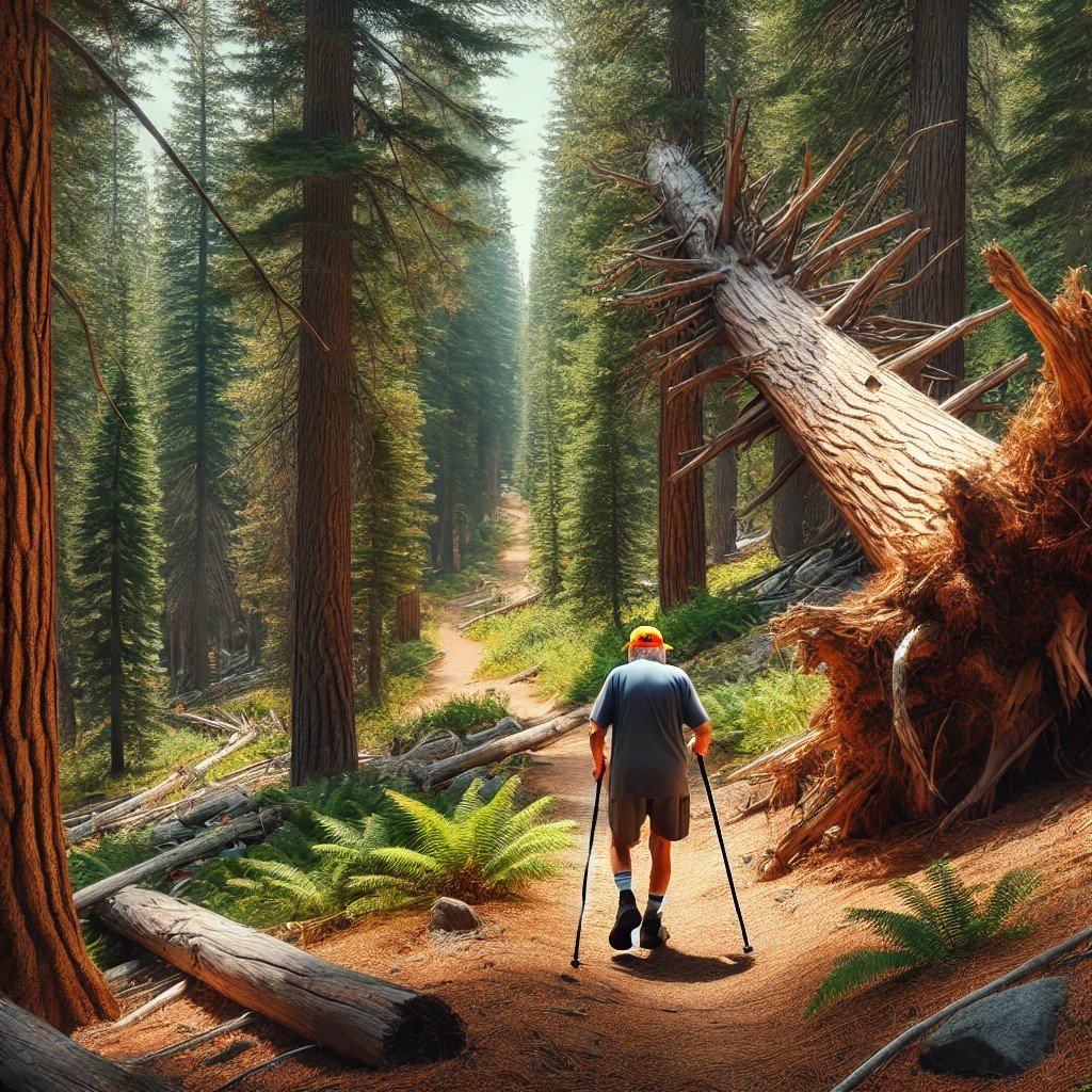 I asked him how far he was going today. “Just a couple of miles,” he replied. His strong lean onto his trekking poles suggested they were closer to walking sticks, and I was almost dismissive that this wasn’t a very fit hiker. He paused close by, assessing the large pine that had fallen alongside the trail, and complimented the Sierra Club for looking after the trail so well since it was created in the 80’s. He reminisced how in his youth, the forest had been full of hardwoods when riding bikes was still allowed.