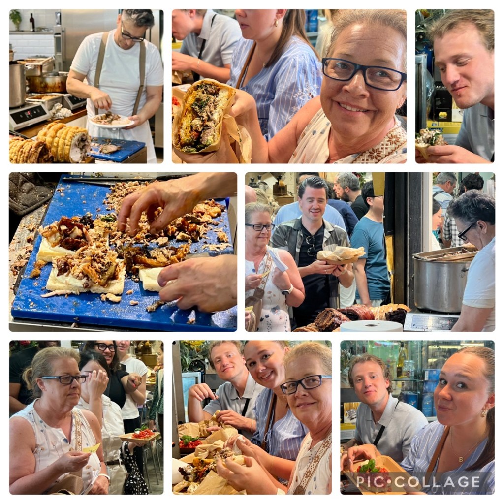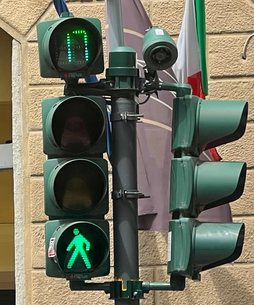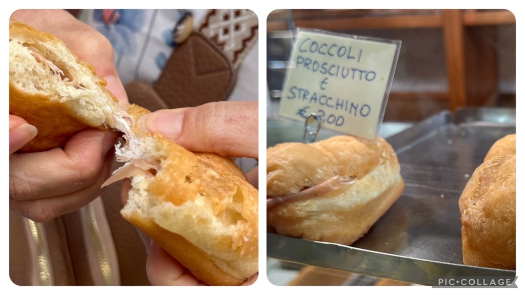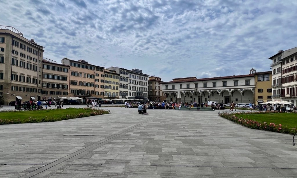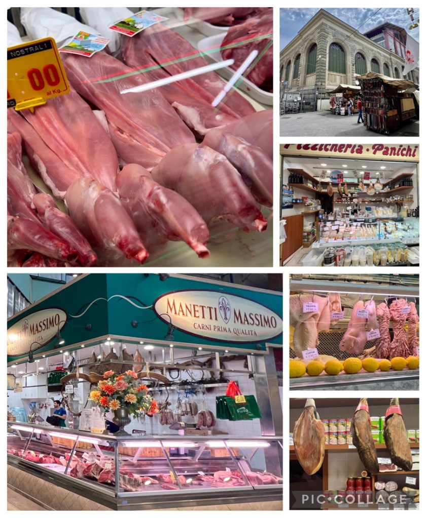 Farewell Rome! On our way to the train station, we passed the Basilica of Saint Mary Major where the most recent pope was buried.While waiting at the station, I picked up our souvenir Starbucks mugs, where the short queue was being disrupted by a robotic floor cleaner! I loved the name “Eataly” where we grabbed refreshments – the chain started in Turin.We enjoyed the view of the countryside as we whizzed through by train, but it made me yearn to go walking in Britain.It was a ten minute walk from the central station to our apartment where we could drop our bags. We had to learn to avoid the trams while not getting our wheels stuck in their tram lines.Florence felt much more welcoming than RomeWe soon found some sites with many of the old buildings decorated in a similar style.The piazzas felt empty compared to Rome! We were visiting mid morning and by mid afternoon they were full.It was cool how they covered the renovations with material to show what the underneath would look like.In the subway by the station, “train lines” on the floor took you to your desired exit. Cool!We found the central market with meat from rabbit to tripe on sale.The man selling pork sandwiches was entertaining and gave away some tasty samples. Janet, Jett, and Peter bravely ordered sandwiches while Bailey settled for a bruschetta. The sandwich had lots of other difficult-to-identify things in it and was a bit much!We perused the busy leather market just outside the food market but it wasn’t our scene. We preferred finding a convenient wall to sit on and people watch.Janet’s research had identified local food specialities to eat in each city. One Florence specialty was coccoli, fried pizza dough, that could be filled with ham and cheese. They were like a savory doughnut and yummy!We wandered around the city checking out a few sites and piazzas. It was a relaxed afternoon.I loved their pedestrian crossing lights. Not only was the man green (unlike white in the US), there was a countdown!This squashed car looked perfect for driving and parking in Italian cities.At 3pm, we could check into our apartment which was fantastic. Our hostess Sarah and her fiancé had done most of the renovation themselves. It had three bedrooms, three bathrooms, a jacuzzi tub and a garden terrace. There was a fancy coffee machine and Sarah left us a bunch of fruit and local treats. We very much enjoyed relaxing at this place.