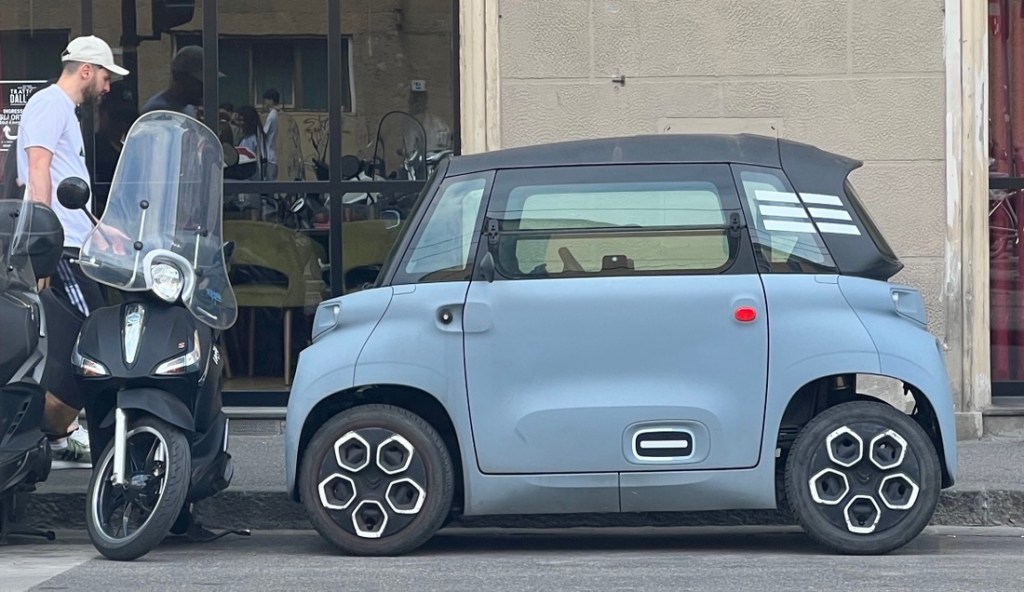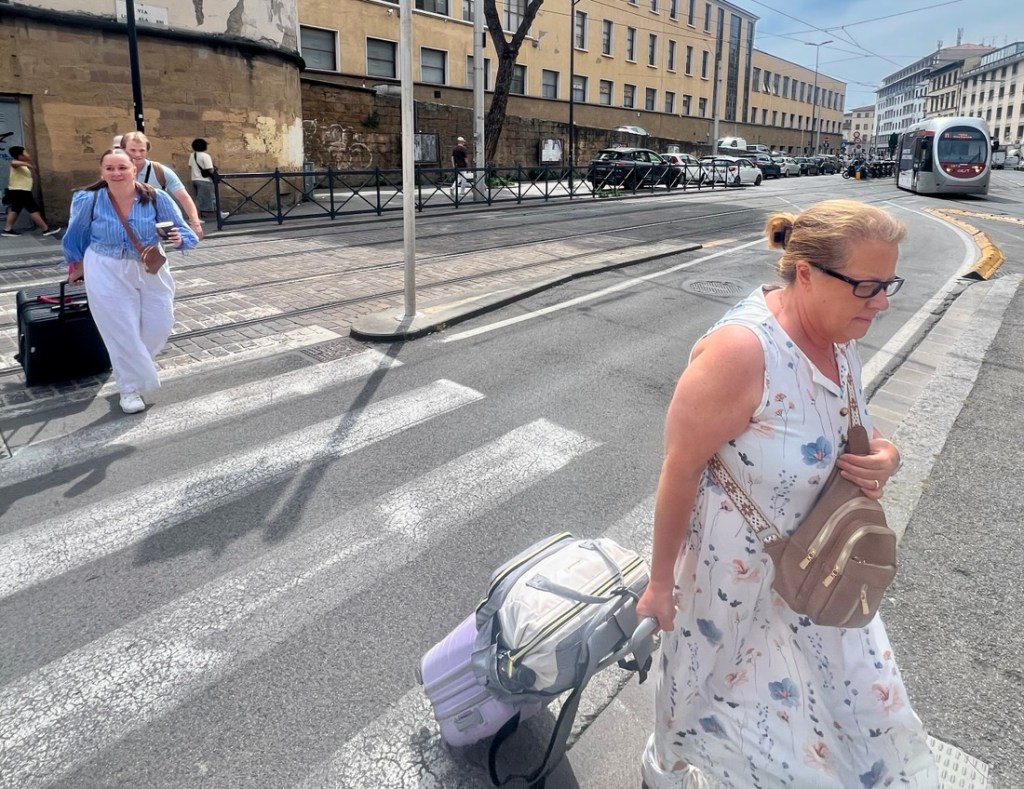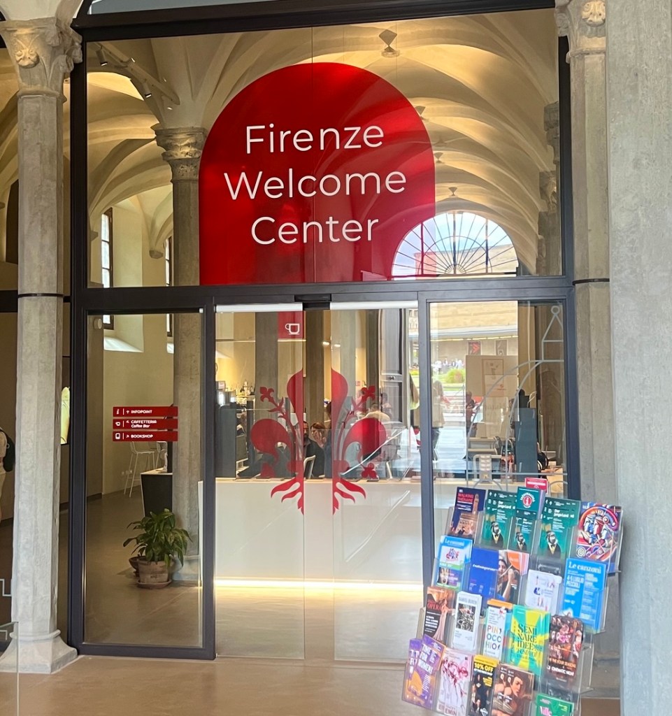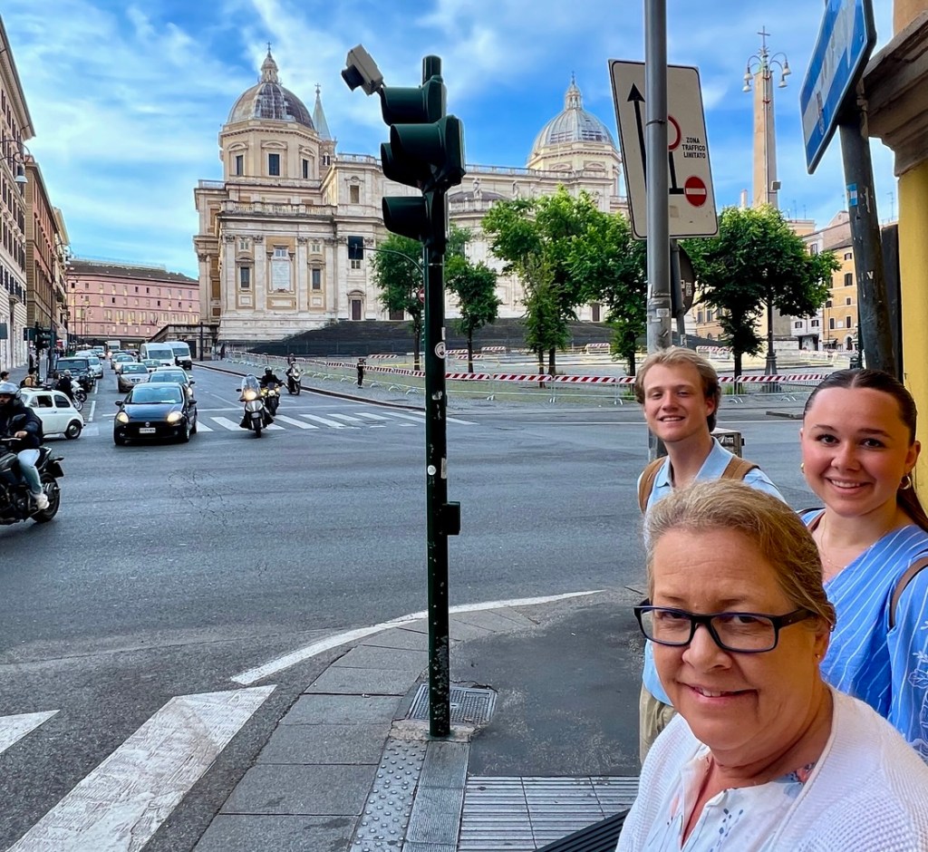 Farewell Rome! On our way to the train station, we passed the Basilica of Saint Mary Major where the most recent pope was buried.While waiting at the station, I picked up our souvenir Starbucks mugs, where the short queue was being disrupted by a robotic floor cleaner! I loved the name “Eataly” where we grabbed refreshments – the chain started in Turin.We enjoyed the view of the countryside as we whizzed through by train, but it made me yearn to go walking in Britain.It was a ten minute walk from the central station to our apartment where we could drop our bags. We had to learn to avoid the trams while not getting our wheels stuck in their tram lines.Florence felt much more welcoming than RomeWe soon found some sites with many of the old buildings decorated in a similar style.The piazzas felt empty compared to Rome! We were visiting mid morning and by mid afternoon they were full.It was cool how they covered the renovations with material to show what the underneath would look like.In the subway by the station, “train lines” on the floor took you to your desired exit. Cool!We found the central market with meat from rabbit to tripe on sale.The man selling pork sandwiches was entertaining and gave away some tasty samples. Janet, Jett, and Peter bravely ordered sandwiches while Bailey settled for a bruschetta. The sandwich had lots of other difficult-to-identify things in it and was a bit much!We perused the busy leather market just outside the food market but it wasn’t our scene. We preferred finding a convenient wall to sit on and people watch.Janet’s research had identified local food specialities to eat in each city. One Florence specialty was coccoli, fried pizza dough, that could be filled with ham and cheese. They were like a savory doughnut and yummy!We wandered around the city checking out a few sites and piazzas. It was a relaxed afternoon.I loved their pedestrian crossing lights. Not only was the man green (unlike white in the US), there was a countdown!This squashed car looked perfect for driving and parking in Italian cities.At 3pm, we could check into our apartment which was fantastic. Our hostess Sarah and her fiancé had done most of the renovation themselves. It had three bedrooms, three bathrooms, a jacuzzi tub and a garden terrace. There was a fancy coffee machine and Sarah left us a bunch of fruit and local treats. We very much enjoyed relaxing at this place.