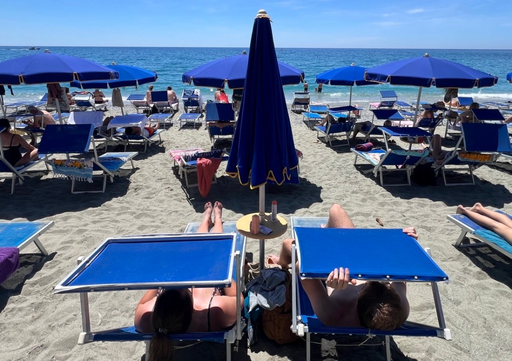We took the train back to Monterosso and rented some beach chairs and an umbrella so Bailey could get her beach time. Peter went for a swim but it was too cold for anyone else. The sand was too hot to stand on! The beach isn’t Janet’s and Peter’s thing so they left Bailey and Jett alone to enjoy it.