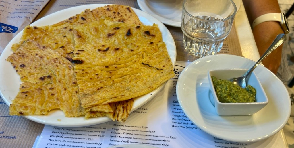 Our wandering led us to a small restaurant called La Pia Centenaria which served the final two things on Janet’s list to try: farinata (pancake made with chick pea flour) and pesto. The restaurant was started by a lady called Pia in 1887 but its former location was destroyed by bombing in the Second World War – probably British or American bombs!