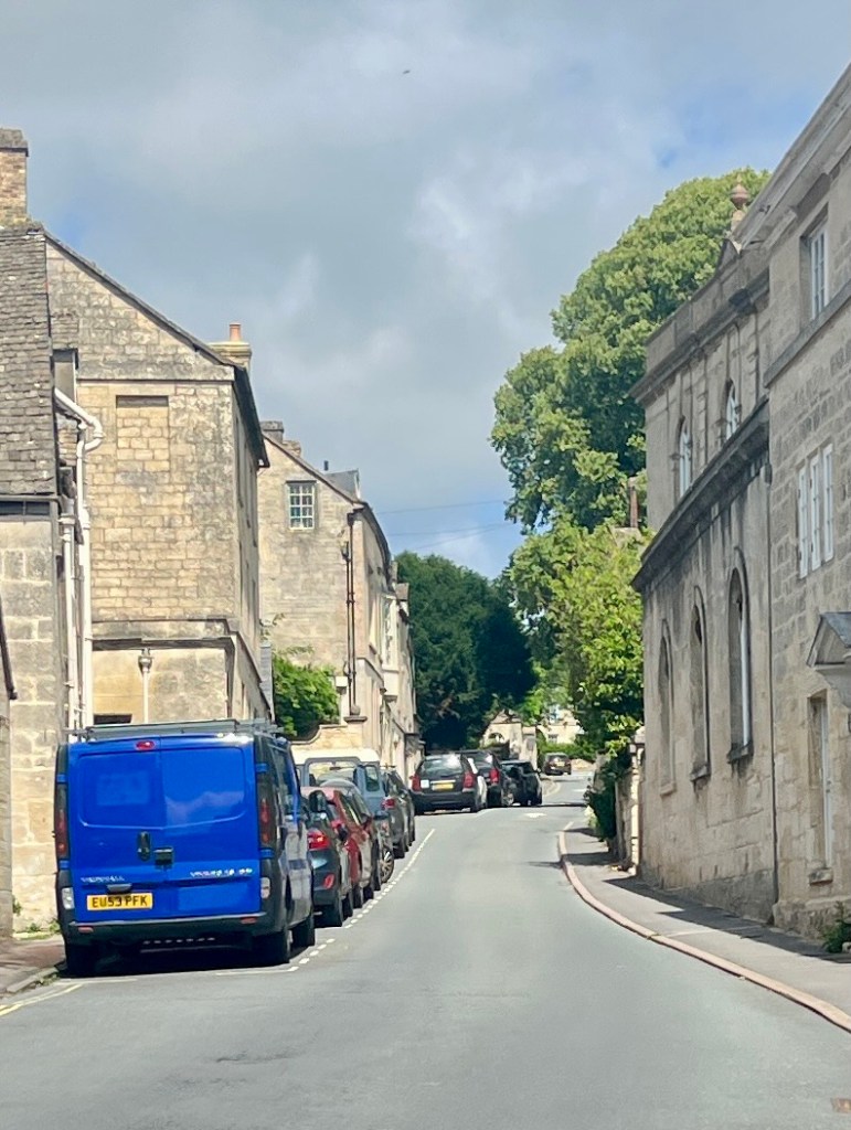 The flight was smooth, as was our arrival and transfer by taxi (by Andy Cars of Gloucester) to St. Michael’s B&B in Painswick. We arrived too early to check in but we could leave our bags and explore. After a fine lunch of bacon buns, a cream tea, a panini, a homemade quiche, and a slice of cake at the town’s Arts Cafe, we were ready for a warmup hike. I chose a route along the Cotswold Way, going north in the opposite direction to the way tomorrow will take us. It took us up a hill through a golf course to a great viewpoint: Painswick Beacon.