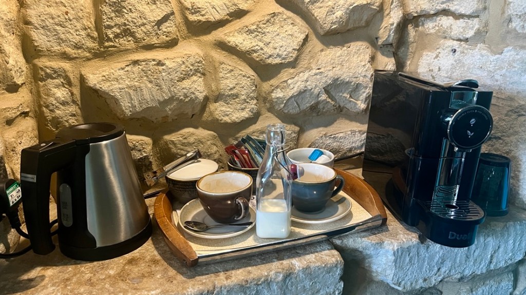 Each bedroom has a coffee station similar to this one. I loved how there was a small bottle of milk in a nearby fridge to make the early morning coffee or tea even better.