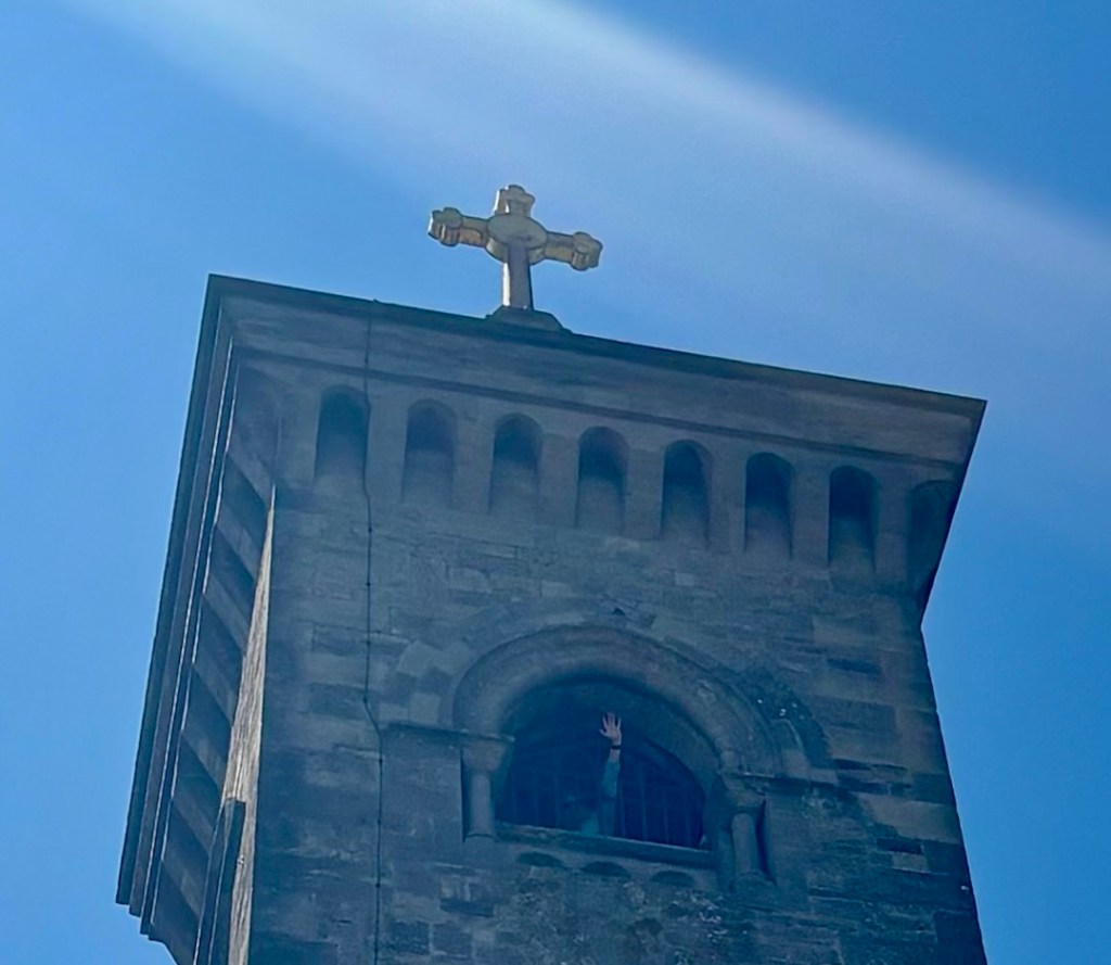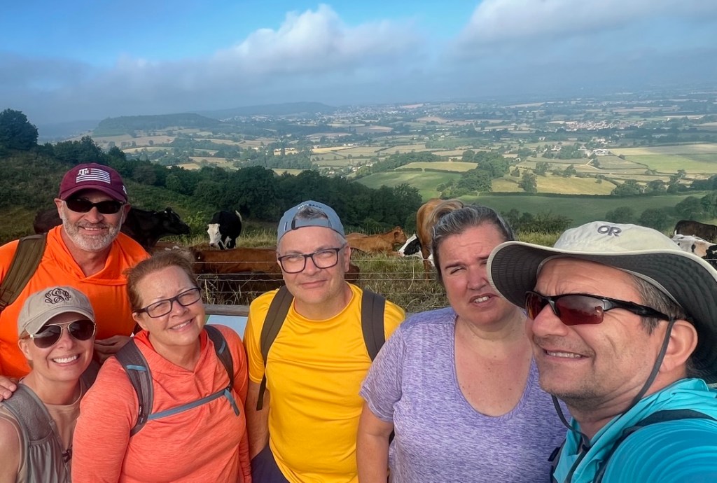 The view back down the escarpment from Coaley Peak toward Frocester and beyond. The road our taxi brought us was below and cars (including our taxi) whizzed along and would not be expecting walkers! Our taxi from Apollo Taxis squeezed our trip in before doing a school run and was perfect.In the rush we had not been able to take our starter photo at the pub, yet it seemed more appropriate here as we took a taxi. What a colourful bunch!Dean was excited when he saw that the map labeled the Forest of Dean (where my dear uncle used to live) in the distance.The first of several groups of cows. Many of these were lying down, normally suggesting rain, but I think this lot were just tired and hot!Coaley Peak’s marker looked down on a patchwork of fields.Farewell Frocester! The path followed a busy road briefly before heading off into the woods.While the day’s walk had three big climbs and four descents, we started with quite a bit of undulating through this entangled Coaley Wood. There might have been a few times that I was asked if this was one of ups or downs when it wasn’t.Throughout the trail we’ve seen abandoned old quarries such as this, labeled on our map as disused.As yesterday’s colour was purple, I chose yellow for today. There were yellow daisies everywhere! There were also poisonous berries (known as Lords and Ladies) that were often red, but we spotted these immature yellow and green ones. Climb number one up Cam Long Down. It’s a bump on the valley floor below the escarpment and a very steep climb. I now realize we could have easily walked around, but we would have missed the view. Just don’t tell Tracy! We weren’t able to walk around subsequent hills.Stephanie elegantly climbs a stile in style over a style of stile that we did not see yesterday.Our view down Cam Long Down back toward Coaley Peak. Cows in the barn were making a racket. We could not work out what was going on!As yellow was the colour of the day, and orange is close (?), I asked for this posed photo which wasn’t met with the most enthusiasm.While this shows the rear ends of several cows, you can also see the Tyndale Monument in the distance. That was where we were heading!During our descent from Cam Long Down on our way into Dursley, we were faced with this traffic jam. Much encouragement was needed to get these bovines to moove along.We hiked past our first sheep! I’d seen a tasty lamb last night – on my dinner plate…Dursley is a good sized market town with a pedestrianized Main Street and this traditional butcher. I liked how he highlighted the supply chain by pointing out he was an “abattoir operator” (i.e. slaughterhouse). Raw meat wasn’t our need so we picked up our lunch at a large Sainsbury’s supermarket, which also had fine facilities!As we climbed out of Dursley, we looked back toward Cam Long Down with Coaley Peak beyond.At the top of “hill 2”, we had the choice of the long or short route. The long route added two miles following the escarpment. The views would have been great and we would have considered it if we weren’t so worried about the heat.The short cut took us across a golf course, one of several we’ve crossed on the Way. Half way down the other side, we found a bench and some soft grass in the shade for lunch where we had a few visitors. Onward to North Nibley and its monument.Before the next climb, we crossed the Doverte Brook where we saw this ~2 ft eel swimming.Climb number three to the monument was a tough one and Janet was thankful to stretch her back on this bench.There was an informative sign at the bottom, explaining William Tyndale‘s local roots before joining Luther in Germany to help get his English translation of the Bible published and smuggled back to England as it was illegal at the time. He was burned at the stake for such heresy but English Bible readers are thankful for such sacrifice.Max and I climbed 121 steps to the top.Great views from the top!My blue arm matched the sky!The view from the top toward Wales.Hello down there.The Cotswold Way below the tower.Group selfie of the day!Good bye and thank you, Tyndale monument.Max found a convenient hole on the path, bringing him down to Stephanie’s level.I loved this carved signpost, highlighting the monument and both human and canine hikers.After 11 miles, 2300 ft of climb, and 6.5 hours, we arrived with thanks at The Swan in Wotton-under-EdgeAn essential device in each of our rooms.We enjoyed a fine dinner in the bar, but we did not force Max to sit in this corner for too long!The British taps can confuse Americans. How do I get warm water? The hot is near boiling, the cold often near freezing. You can either use the plug, or “do the dance” moving your hand between two streams to avoid burns or frostbite. To cool off, I took a cold shower and, oh boy, was it cold! I might have screamed…