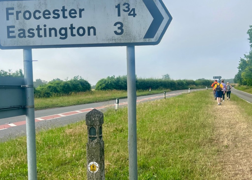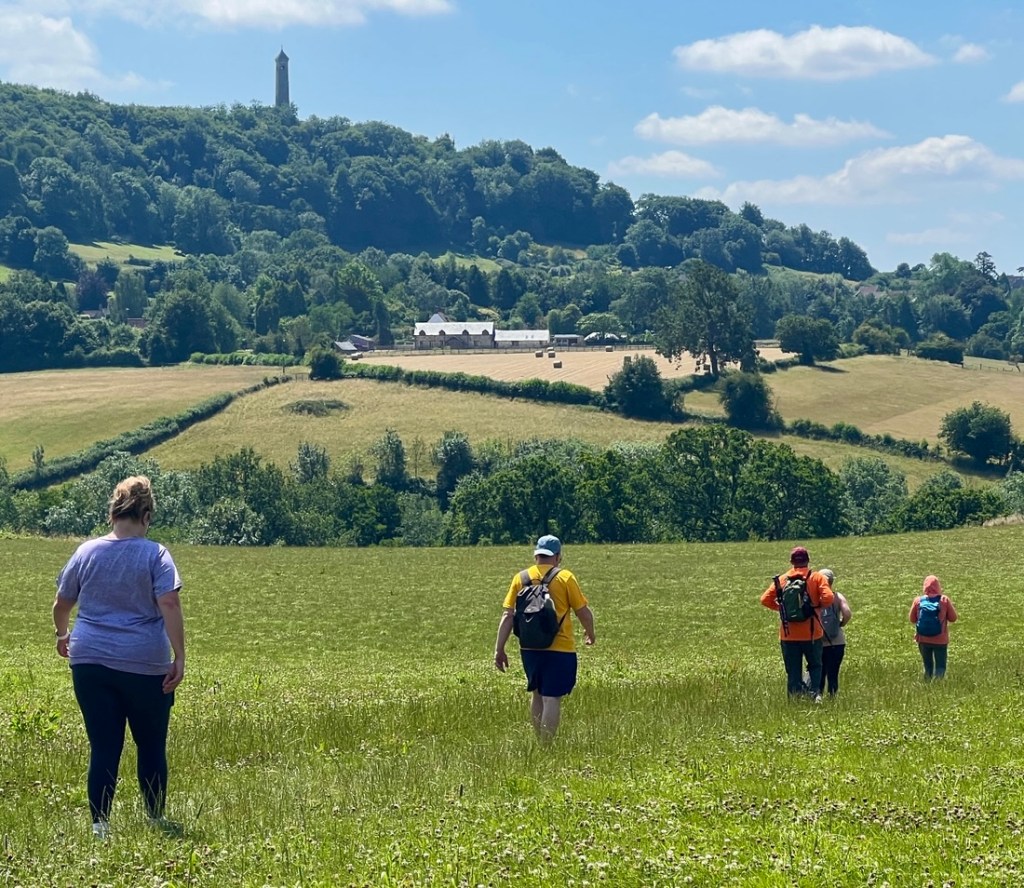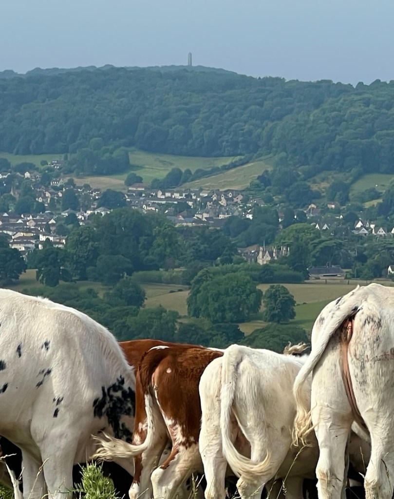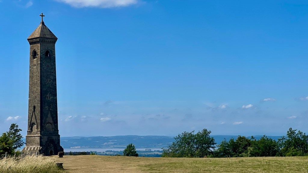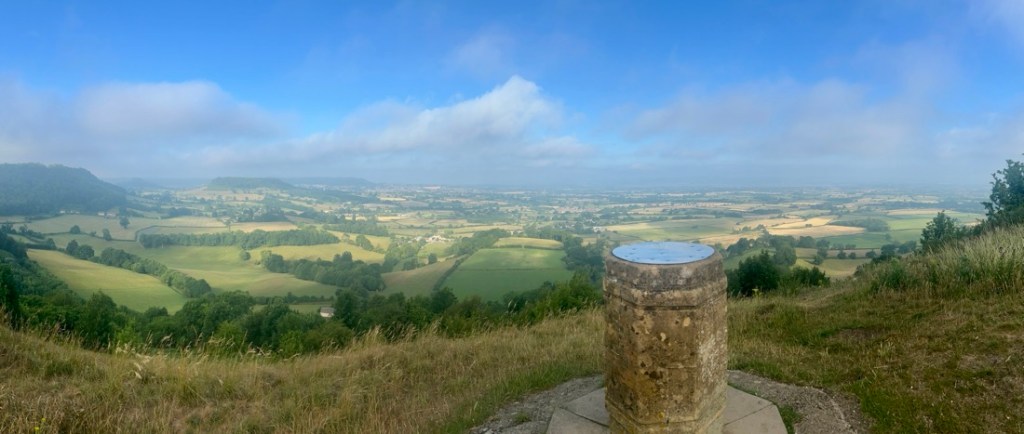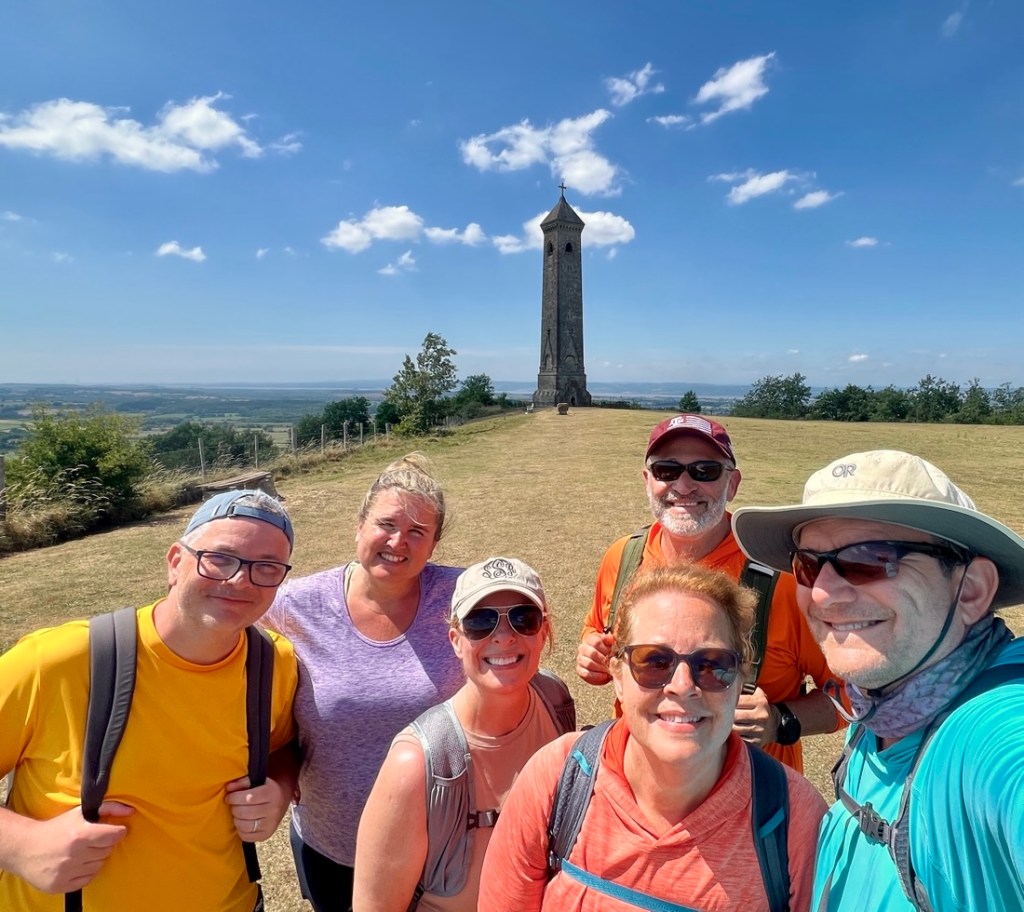 Three steep climbs on a blistering hot day made just finishing the 11 miles from Coaley Peak to Wotton-under-Edge a very satisfying accomplishment. The day’s highlight was the Tyndale Monument recognizing local man William Tyndale who was burned at the stake in 1536 after publishing his English translation of the Bible. We also enjoyed cows, woodland, and big views.