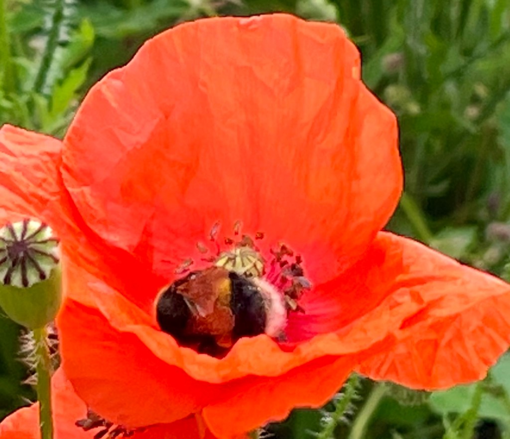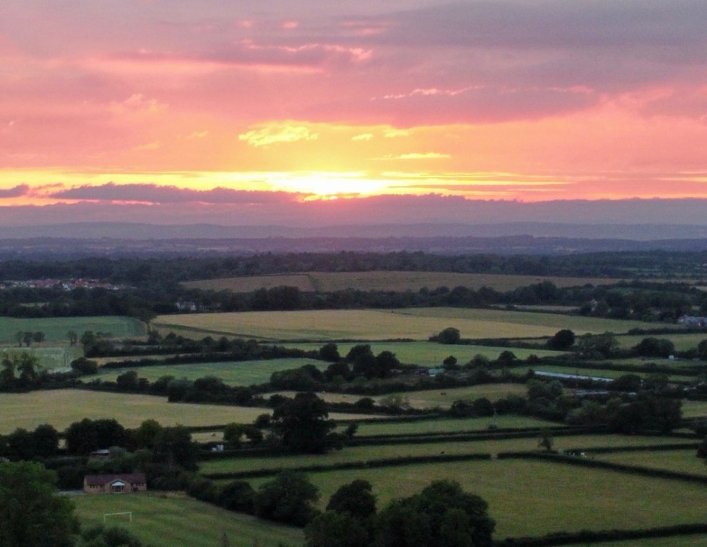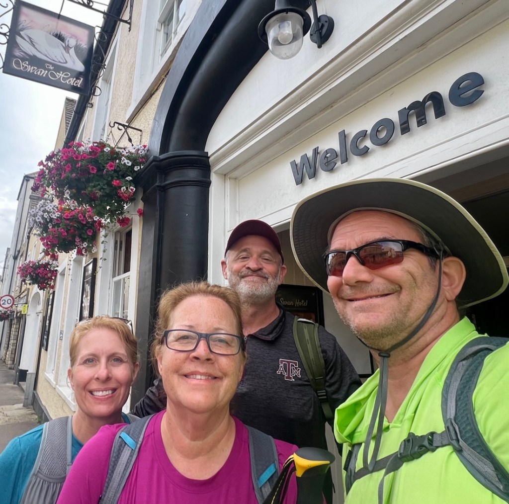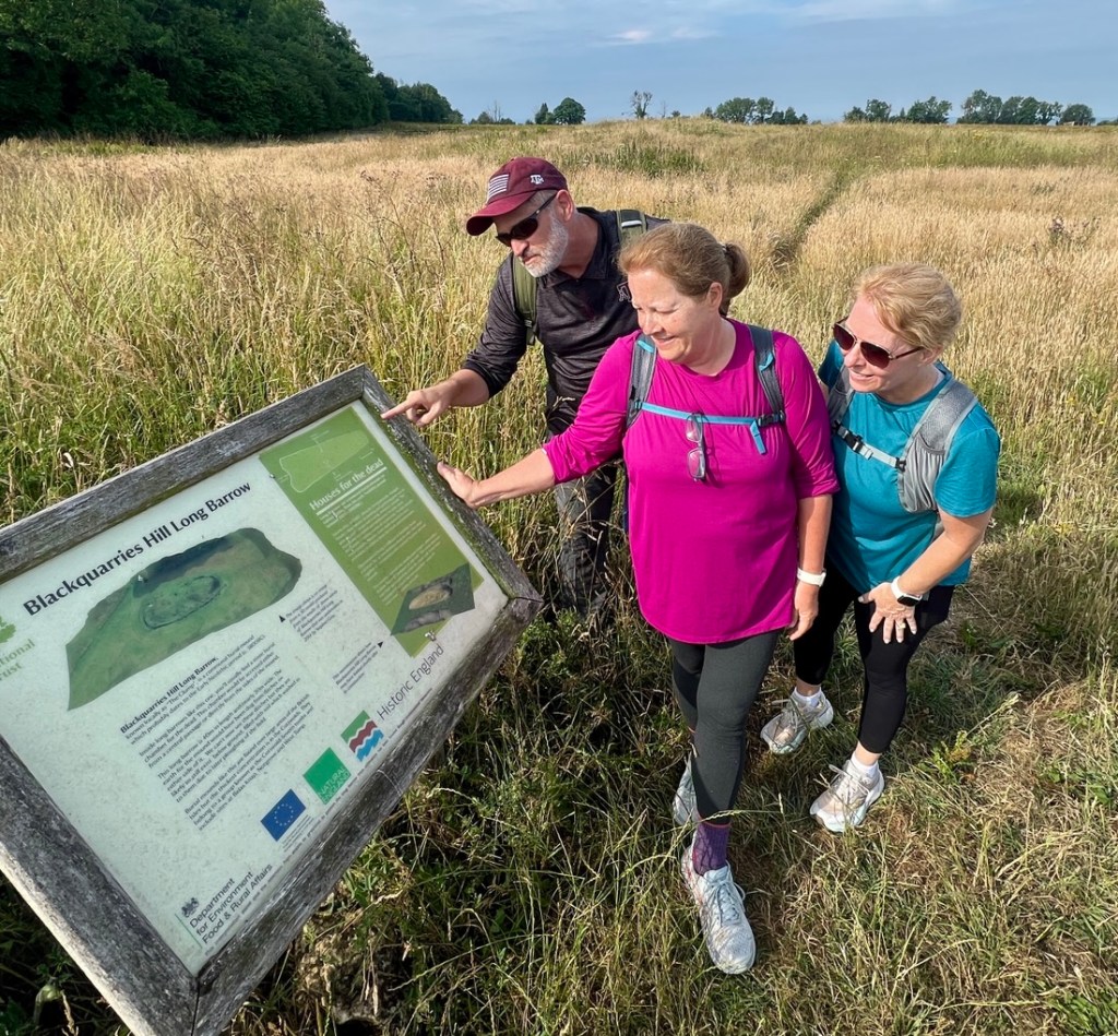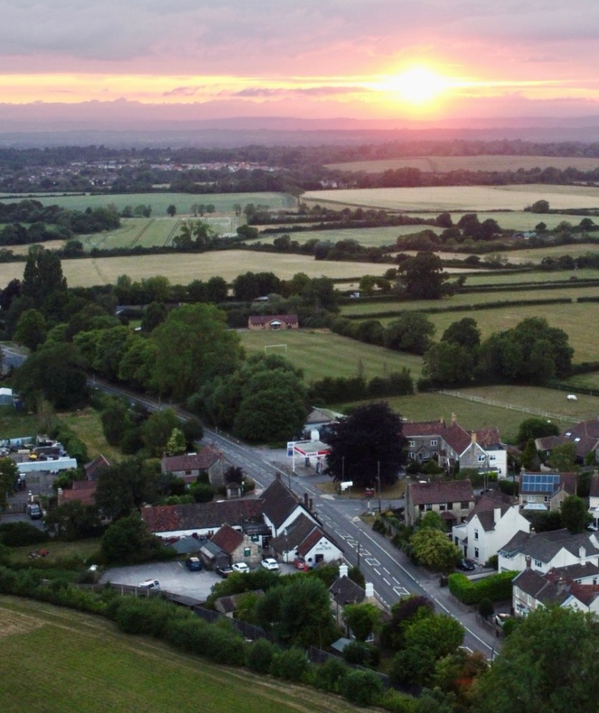 After that first hill, the day was as Max described – a lovely walk. The trail meandered through undulating woodland and small villages on a variety of trails. We were saddened by the lack of signage to Nancy Farmer’s Bottom and the missed photo op. We enjoyed a very small detour (that we at first missed) to St. Kenelm’s Church in Alderley which had a beautifully crocheted scene of the Cotswold Way in an enclosure just outside the church wall. We found a couple of ripe blackberries and some raspberries that were hanging over the trail. We failed to find fossils in an old quarry but we discovered a waterfall! We chose the bumble bee as a photo theme rather than a specific color. Another short detour was to a Long Barrow, a ~5000 year old burial site, which in practice, is just a grass-covered mound of dirt! Our diversion into Hawkesbury Upton was longer than hoped. However, the fresh sandwiches and sausage rolls from the village shop were most welcomed and Stephanie explained she would never buy lunch from a place like that in Texas, the closest being a convenience store at a gas station. To make the visit even more English, I got them to try a Ribena (a black currant drink that I grew on) which they described accurately as like grape juice. We smiled at the direct approach one villager took to getting drivers to slow down in their village, asking motorists to “kill the speed, not the children.” Our OS Map helped us find a shortcut back to The Way. I ended the day with a drone flight to get some sunset pictures.