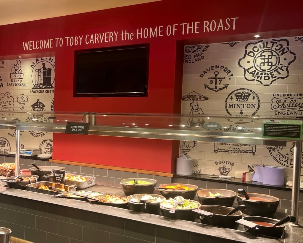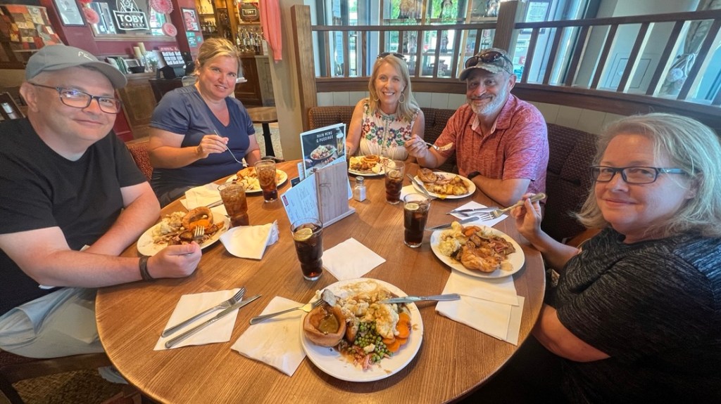 It was a short walk with our luggage to Bath Spa railway station and an easy 20 minute train ride to Trowbridge. It was Max’s first ride on a train so he was extra excited. The journey followed the River Avon and the Kennet and Avon Canal for much of the journey. At Trowbridge station, Dean and I squeezed all of our luggage into an Uber and dropped it off at our boat’s marina before meeting the gang at a carvery restaurant that specializes in roast dinners. After a fine, large lunch, it was time to buy some groceries for our three nights on the boat.