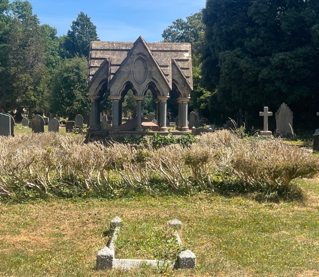 The Toby Carvery is one of our favourite restaurants in the UK. We avoid busy times and particularly enjoy the self-serve, all-you-can-eat veggies with a choice between four roast meats.Four meats to choose from. You can have some of each!Most important is the large amount of gravy with the Yorkshire pudding.In addition to the fine meal, we were made most welcome by Victoria the hostess. I expect the restaurant does not get many tourists and we had fun chatting with her.After eating and buying some groceries, our walk through town to the marina took us past a large intriguing graveyard.The gang also saw their first thatched roof.