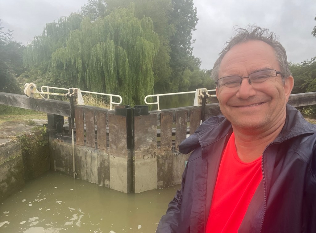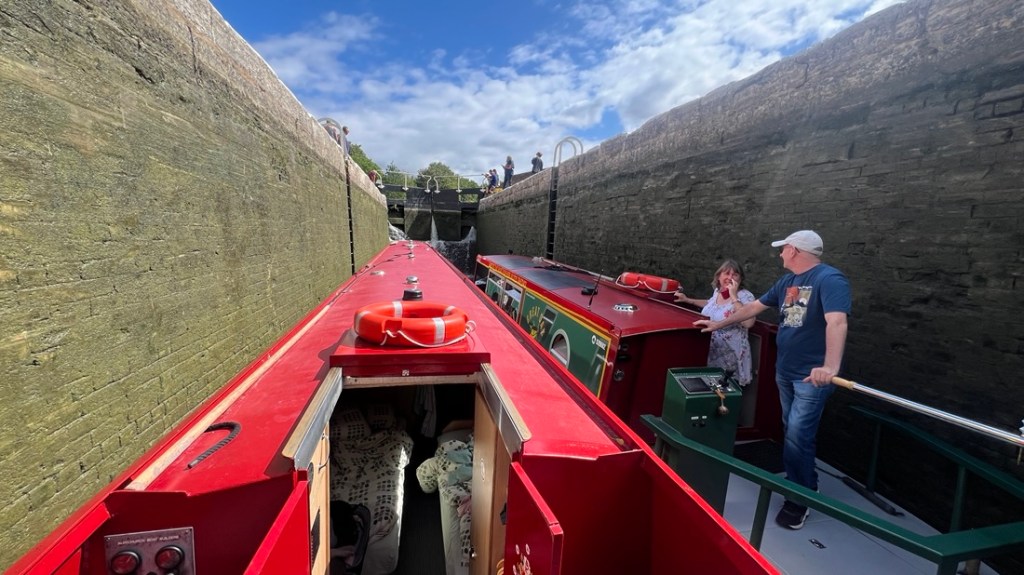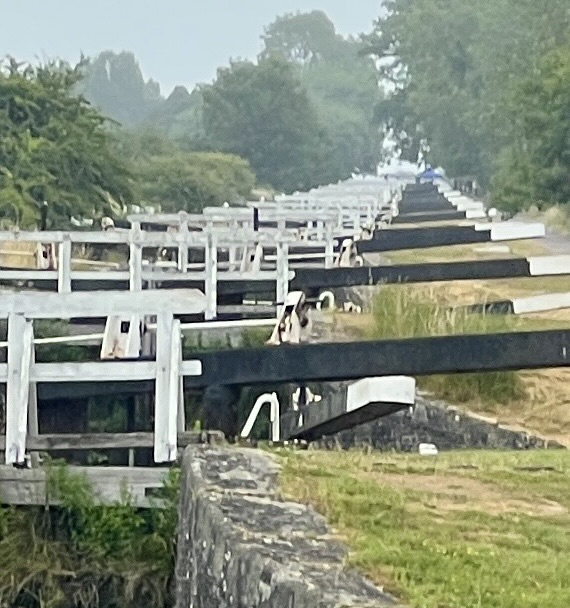 Stephanie, Tracy, and Max ready to push one of the lock gates closed. We did not stop for the rain!Janet was experienced from previous trips.Dean checked the front of the boat’s position in the lock. There was only 1-2 ft spare in the locks – our boat was the longest that would fit.I stayed on the tiller at the back of the boat, trying to keep the boat away from the sides and lock gates. Fortunately, they were quite forgiving.Sometimes the locks were adjacent to bridges.On one occasion, we joined another boat in the lock. There was just enough room!My favourite time was watching the lock gates open when the water levels had equalized.There was a special sequence of locks called a flight where there were about 15 locks in a row to get up a big hill. We walked up this Caen Flight to take a look as it would have taken most of a day to take a boat through. There was a great cafe at the top!Compared to the locks, swing bridges were easy. Max and Dean would unpin it then push it out of the way, allowing me to steer the boat through. We all became used to jumping on and off the boat for swing bridges and locks, but the number of them meant that it wasn’t as restful as we’d expected!
