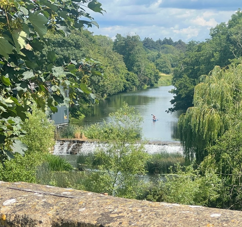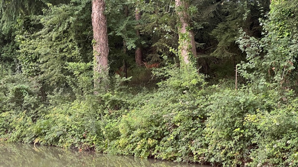 We ate at this pub which had its own moorings and plenty of seating right next to the canal.Janet tried to shoo this swan family out of the lock. Unfortunately, they swam in as we cruised out so we had to trap them in. We were happy that they were no longer trapped when we returned.We passed this cool Shetland pony.Lots of birds followed us. We could tell they were used to being fed!This heron wasn’t very shy.The swans were friendly!Earlier in the evening, this momma had three baby chicks. We saw a seagull swoop down, grab one, and fly away with it! We tried to protect the other two by throwing rocks at swooping seagulls, knowing it was futile. Max named these chicks Huey and Dewey, with Louie having been lost 😞.What pretty doors on the back of the boat. We also discovered that they come off quite easily when the gangplank catches underneath, fall into the canal, and sink! Fortunately, Dean and Max were able to grab it in shallow water…I had been looking forward to getting some cool drone shots of the boat. This would have included our requisite selfie. I thought I could take off from the deck when we were moored. The drone took off fine, but then the magnetic interference sent her haywire and she uncontrollably flew straight into trees on the other side of the canal. I was ready to write the drone off but Max was determined to lead a search and rescue mission if I could get him over the canal. I blocked the canal for a while with our boat, but it was late and no other boats came.Max found the drone!The following morning, we saw a couple of deer on the other side of the canal.Another highlight was checking out the Avoncliff Aqueduct which crossed the River Avon, a road, and the railway.A happy crew on the aqueduct.The River Avon below the canal.It was great that Kerry and Graham could visit.