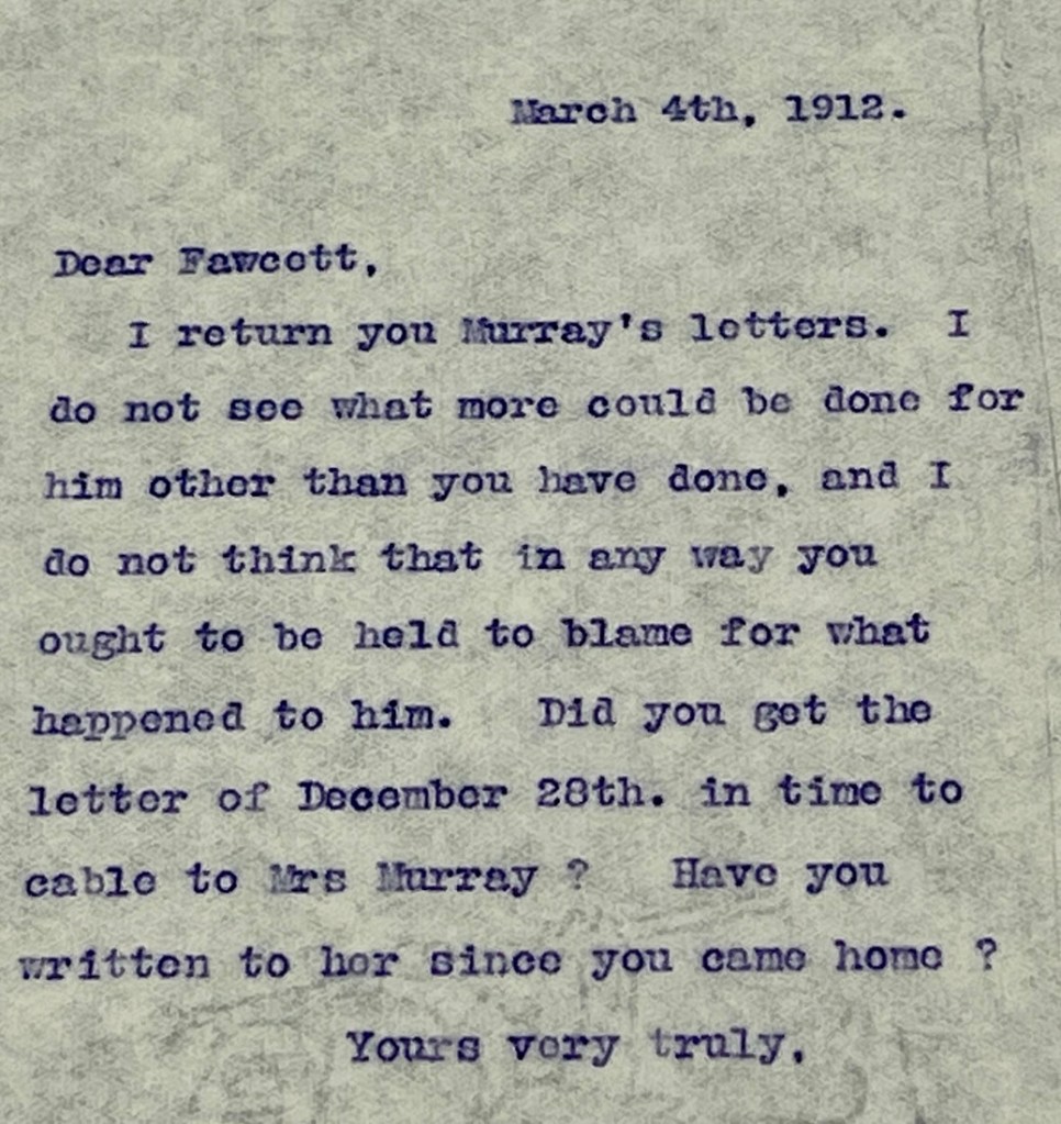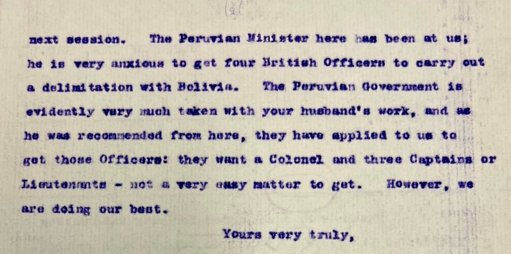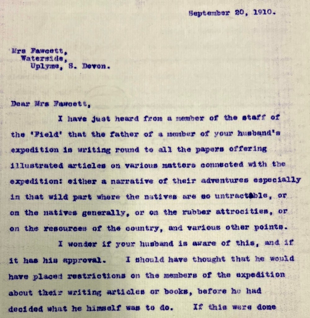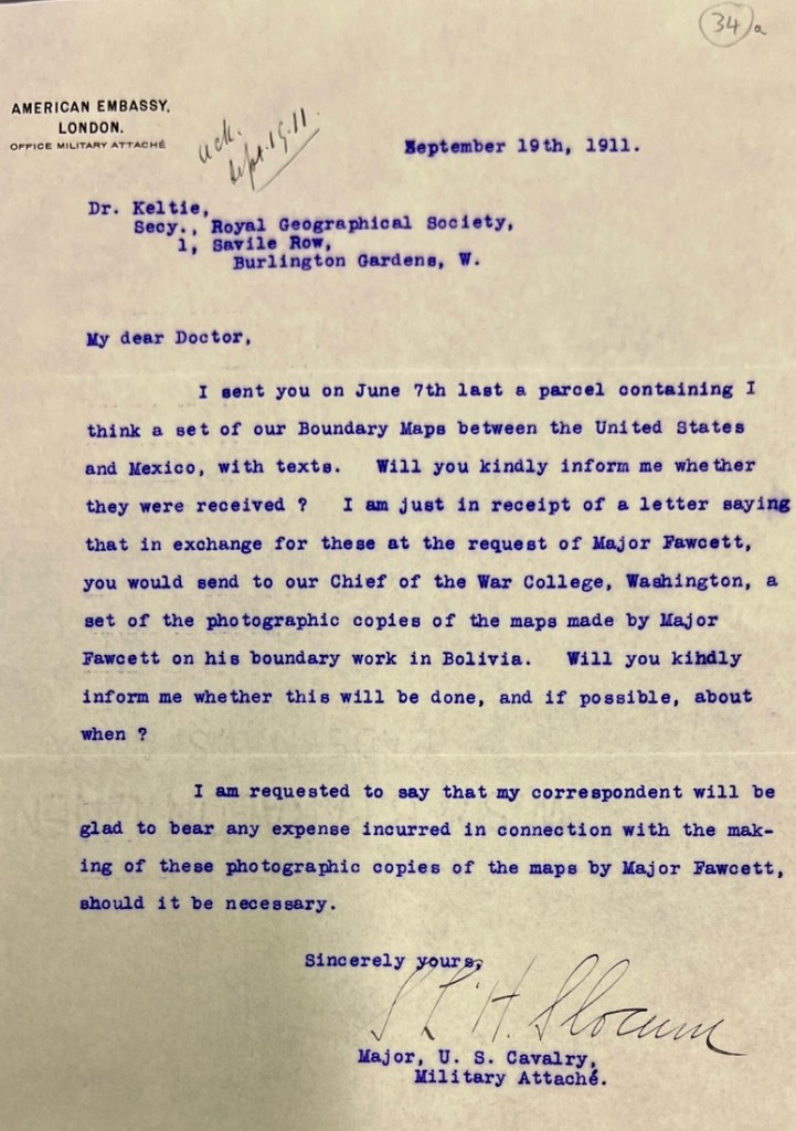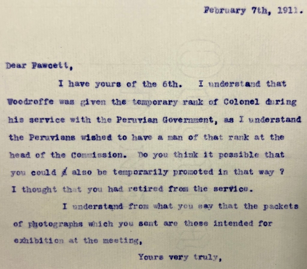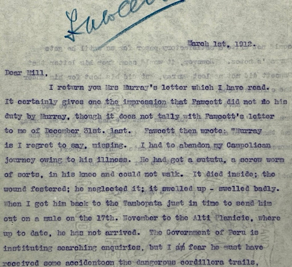 Within the online catalog was the entry “The Fawcett Collection.” This comprised of over thirty folders of correspondence and various other documents. We selected a small sample, and quickly found even that overwhelming. Most of what we reviewed was correspondence to and from Dr John Keltie, the society’s secretary, that was pertinent to Fawcett between March 1906, when the RGS invited Fawcett to lead a survey of the boundary between Bolivia and Brazil, and March 1912, when we stopped due to pending exhaustion. The collection included letters that the RGS had received and carbon copies of the typed responses that Keltie had sent. Trying to decipher handwritten letters was very challenging. We also reviewed correspondence from 1927 after the RGS had officially declared Fawcett missing.