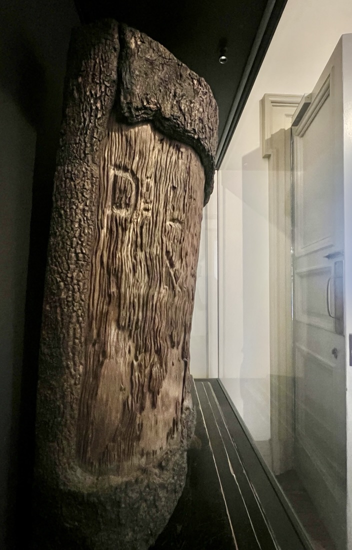 As we passed into the original 1913 building, past the “No Entry” sign indicating it was only accessible to members and fellows, we entered a short hallway that I will call the Livingstone nook. We had noted Livingstone’s statue on the building’s outside wall as we arrived, but this little exhibit inside was extraordinary. When the missionary explorer David Livingstone died in Africa in 1873, his heart was buried beneath a tree in Africa while his body returned to England, as per his request. A commemorative inscription was carved into the tree. When the tree died, the section with the inscription was brought to the RGS and is on display. The wood contains Livingstone’s heart!