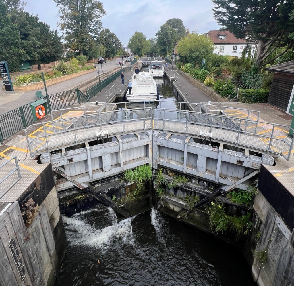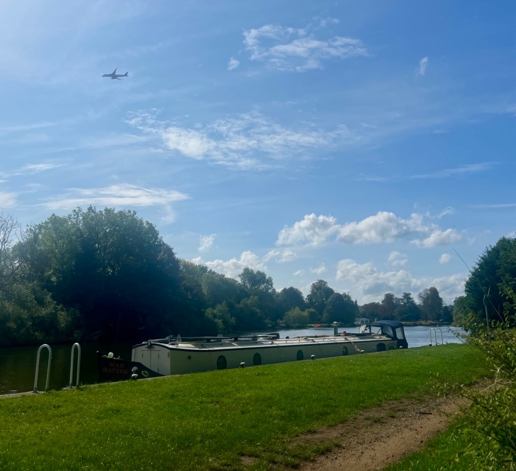 On leaving Maidenhead, the green tunnel returned. We were next to Eton College’s rowing lake and Windsor racecourse was close by on the other bank, but the views were mostly blocked by trees. We enjoyed some clearings, including a stop for lunch when we counted the planes queueing up to land at Heathrow, and watched Eric and Keesha’s plane bring them safely towards Heathrow.
