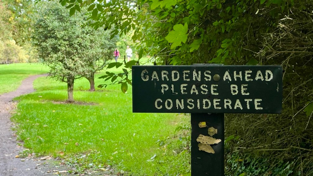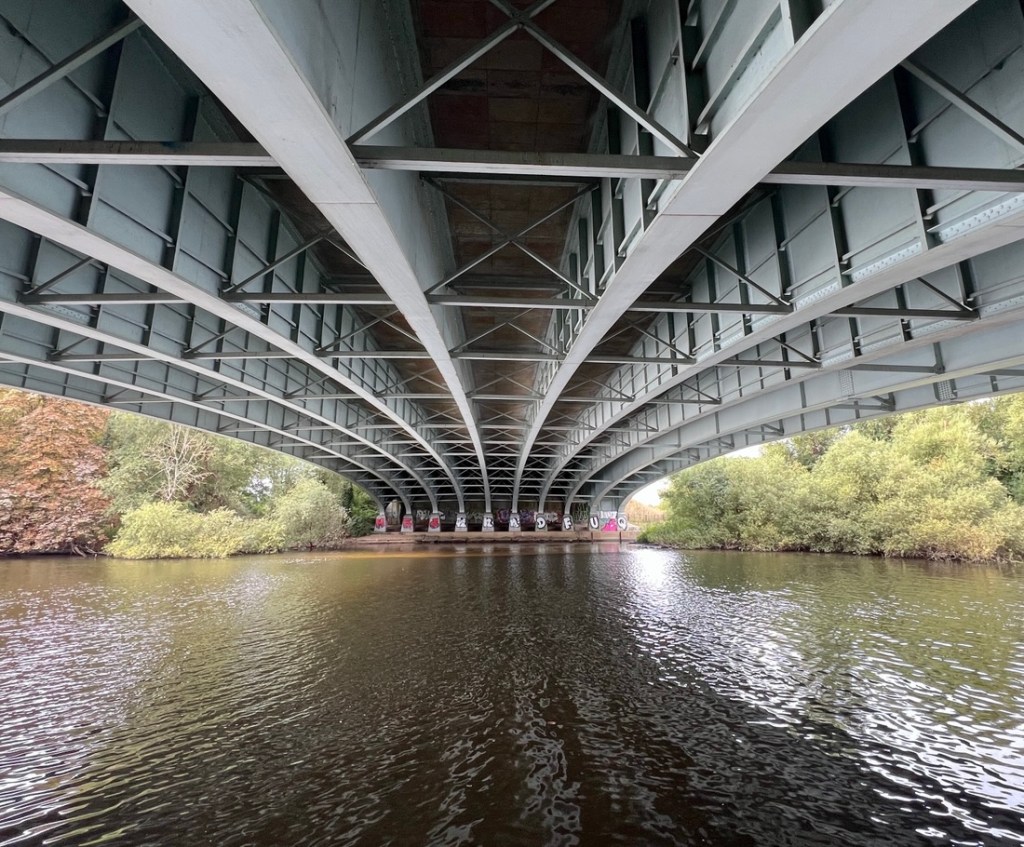 A bridge allowed a great view of Boulter’s Lock.Lots of moored boats in the outskirts of Maidenhead.We need to go over that bridge!A pretty view upstream from Maidenhead road bridge, looking back at where we’d walked.Maidenhead had a large rowing club and we saw many rowers including this quadruple scull and their coach boat pass under the Maidenhead Railway Bridge, designed by Isambard Kingdom Brunel and opened in 1839.The view from underneath the M4 motorway just downstream of Maidenhead.Such a polite English sign!