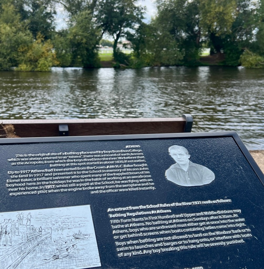 This information board explained that pupils at Eton College would swim in the Thames at this location that they called Athens.Our first view of Windsor Castle, towering over the Thames.The view of our hotel from Eton Bridge. Later, we had welcome drinks with Eric and Keesha in the open courtyard, overlooking the river, and enjoyed dinner of jacket potatoes with baked beans and steak and ale pies in The Brasserie.We enjoyed the beautiful views but it was a bit crowded – with tourists, swans, and geese!The end of an eleven-mile day four.