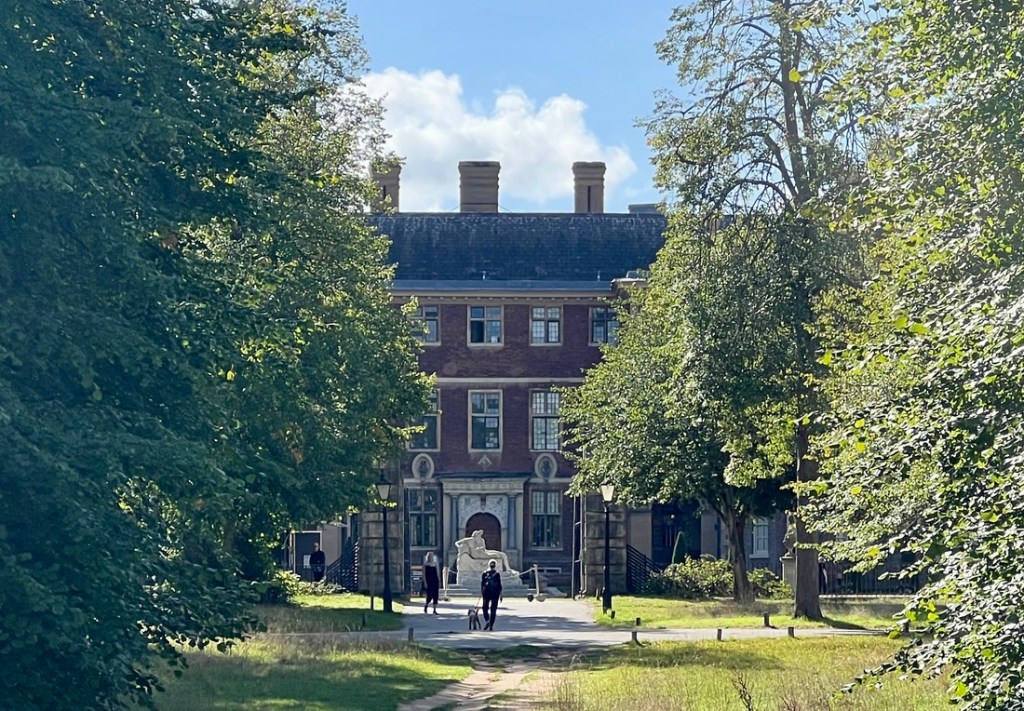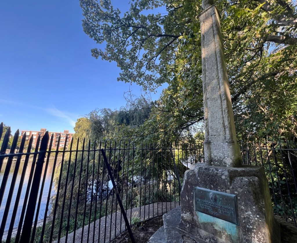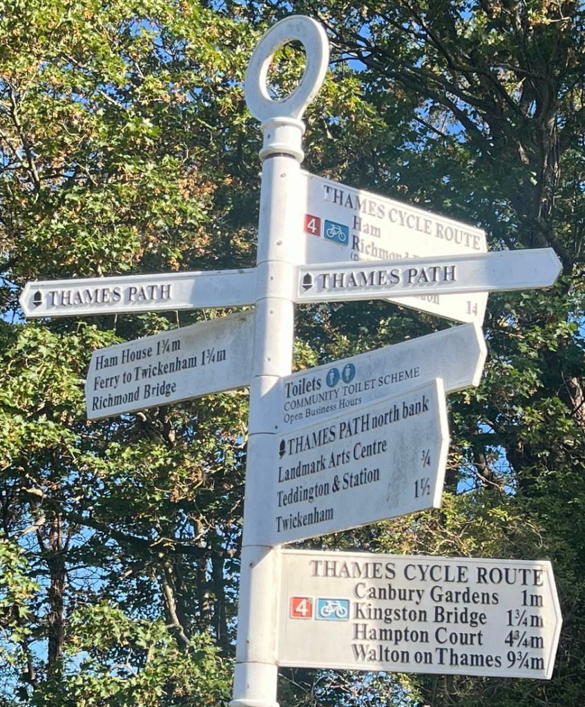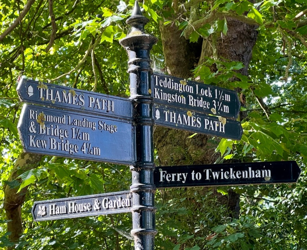 We passed the lock close to low tide, and on its downstream side we could see that the water level was about six inches lower than high tide.This column marked the boundary of control of the river from the Thames Conservancy (upstream) and the Port of London Authority downstream.This outdoor activities centre retained its water with the help of a lock gate.As we walked downstream, we could tell the tidal range was larger from the stain on the opposite bank and the exposed mud.A wide Thames and feeling very much in the country, with Richmond Hill in the distance.We walked past Ham House and its estate.Another signpost confirming we were on the right path!