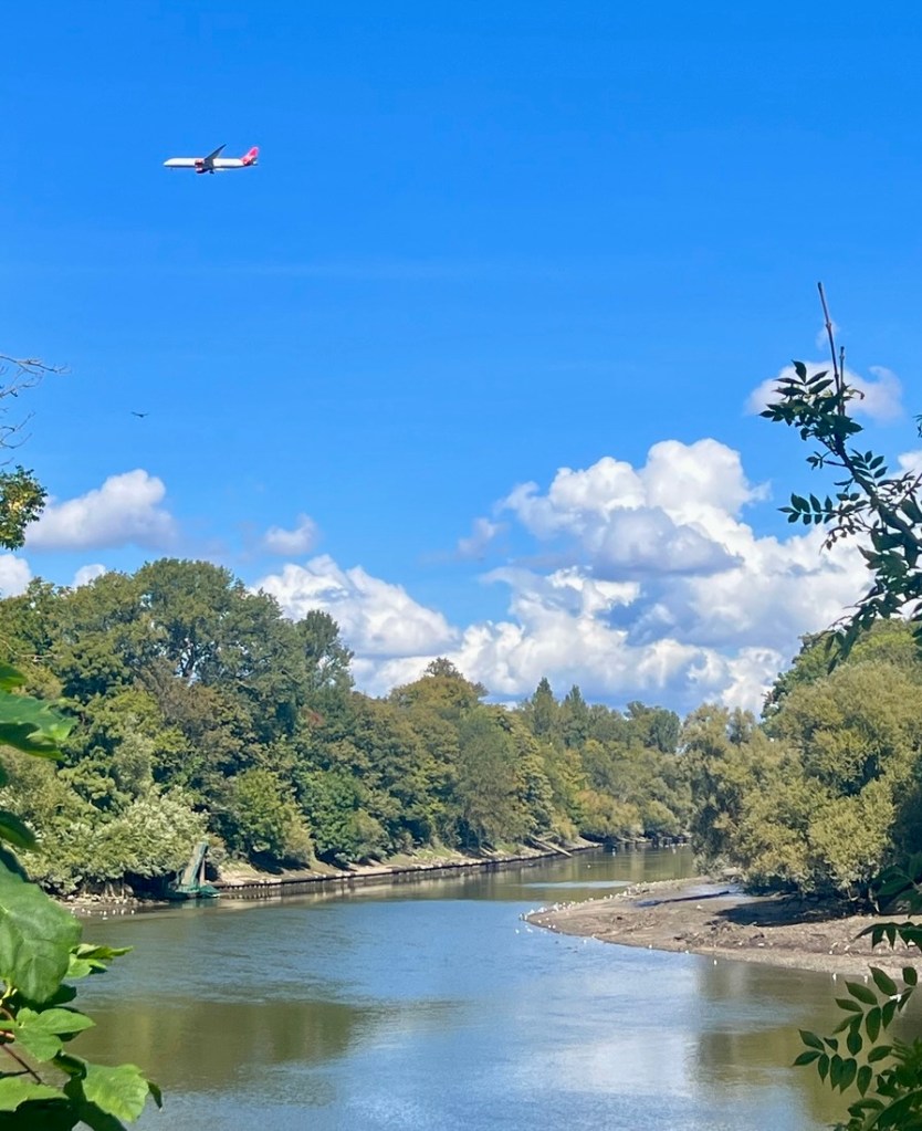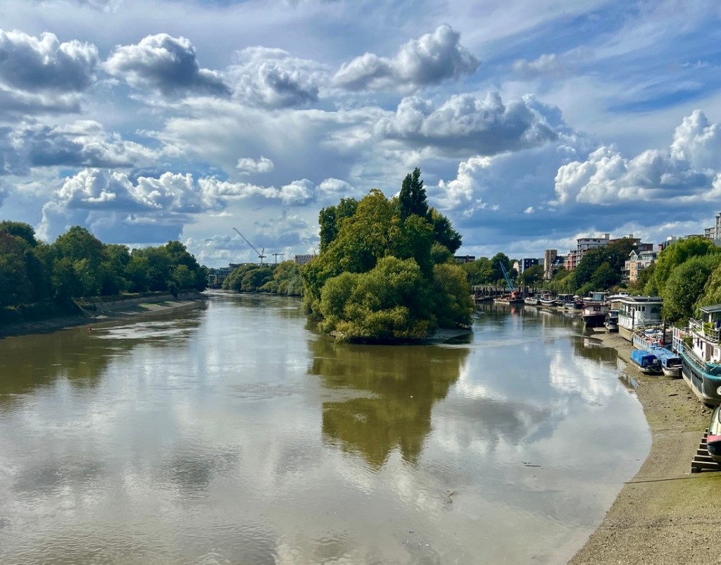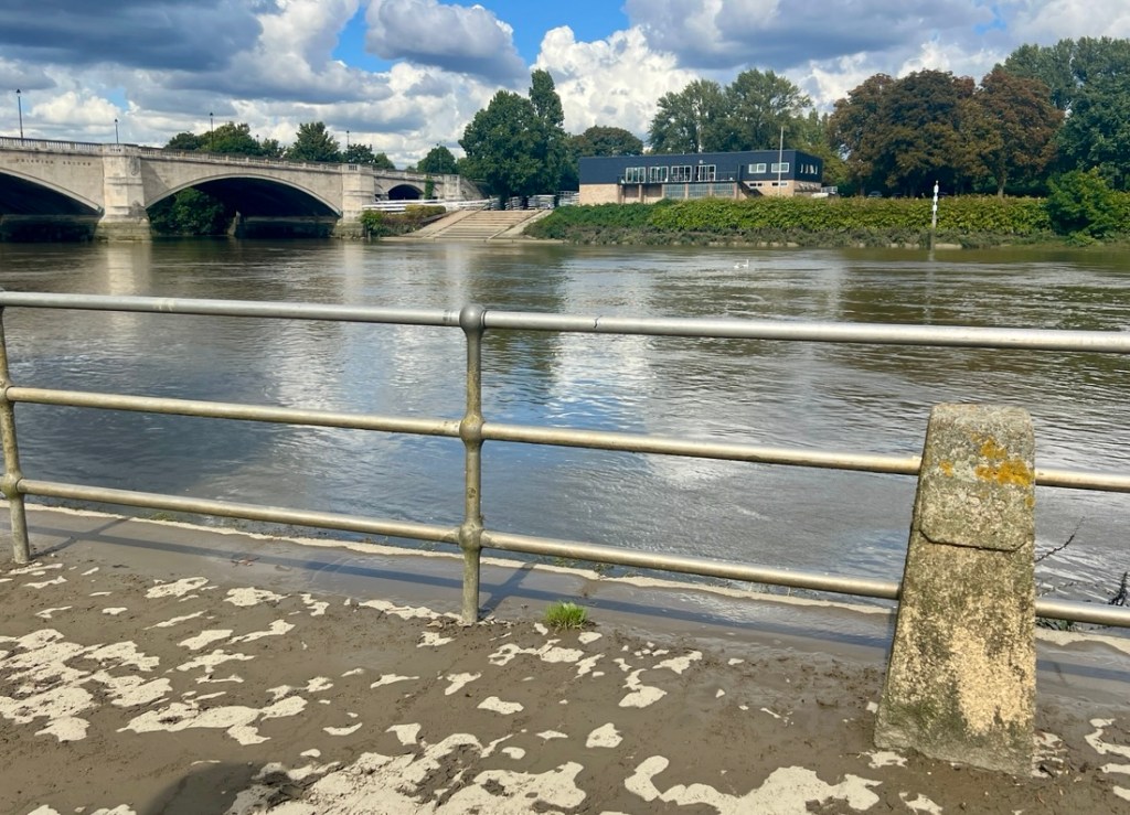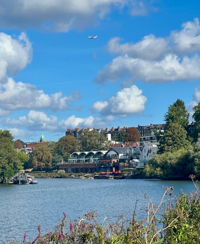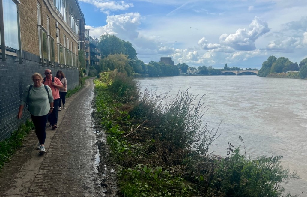 I had expected this to be very similar to the previous day but it was surprisingly different. On the downside, a collapsed path by Kew Gardens forced a detour on the north bank which added a mile, making it about a 13-mile day. On the plus side, the impact of tides on the the Thames below Teddington Lock made the river different from what we’d seen, and our walking it between low tide and high tide emphasized the 15-foot tidal range as we watched lots of rowing boats whizz by.