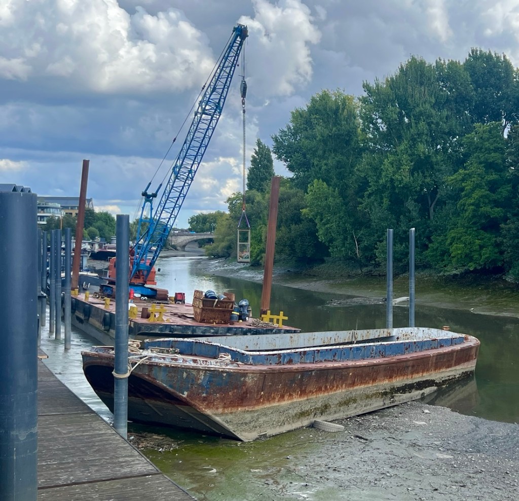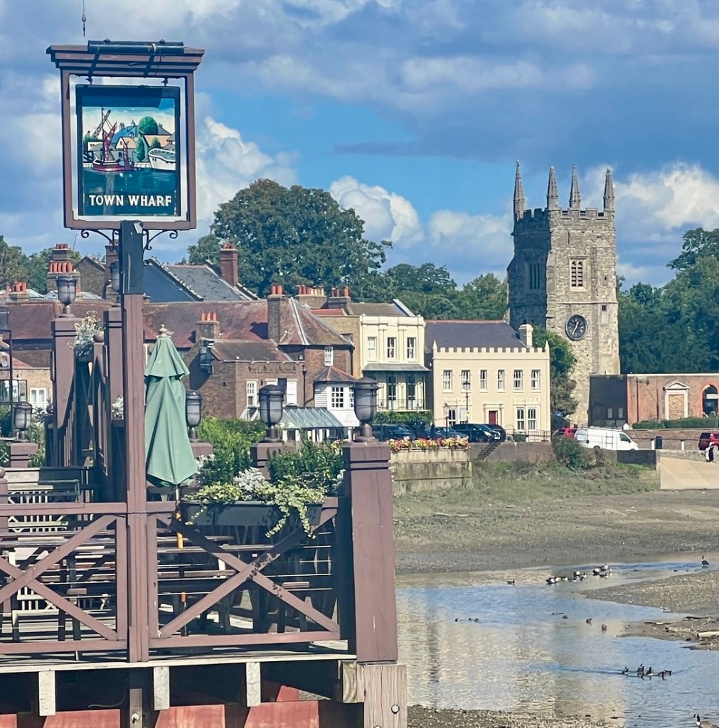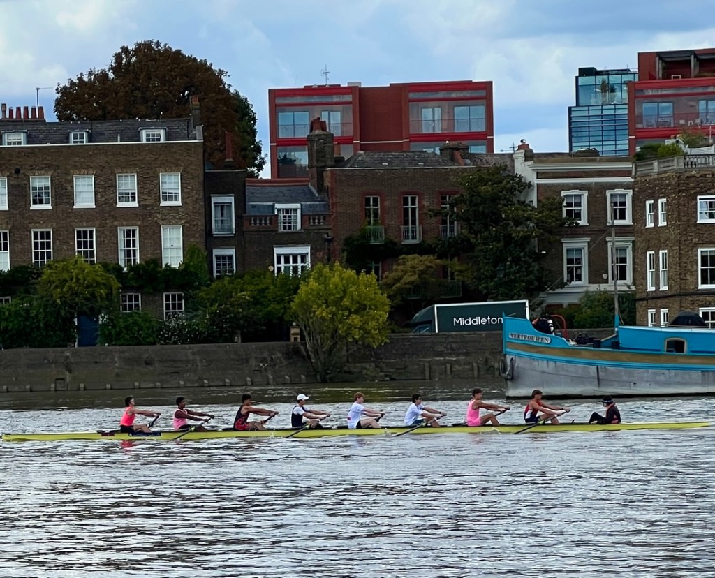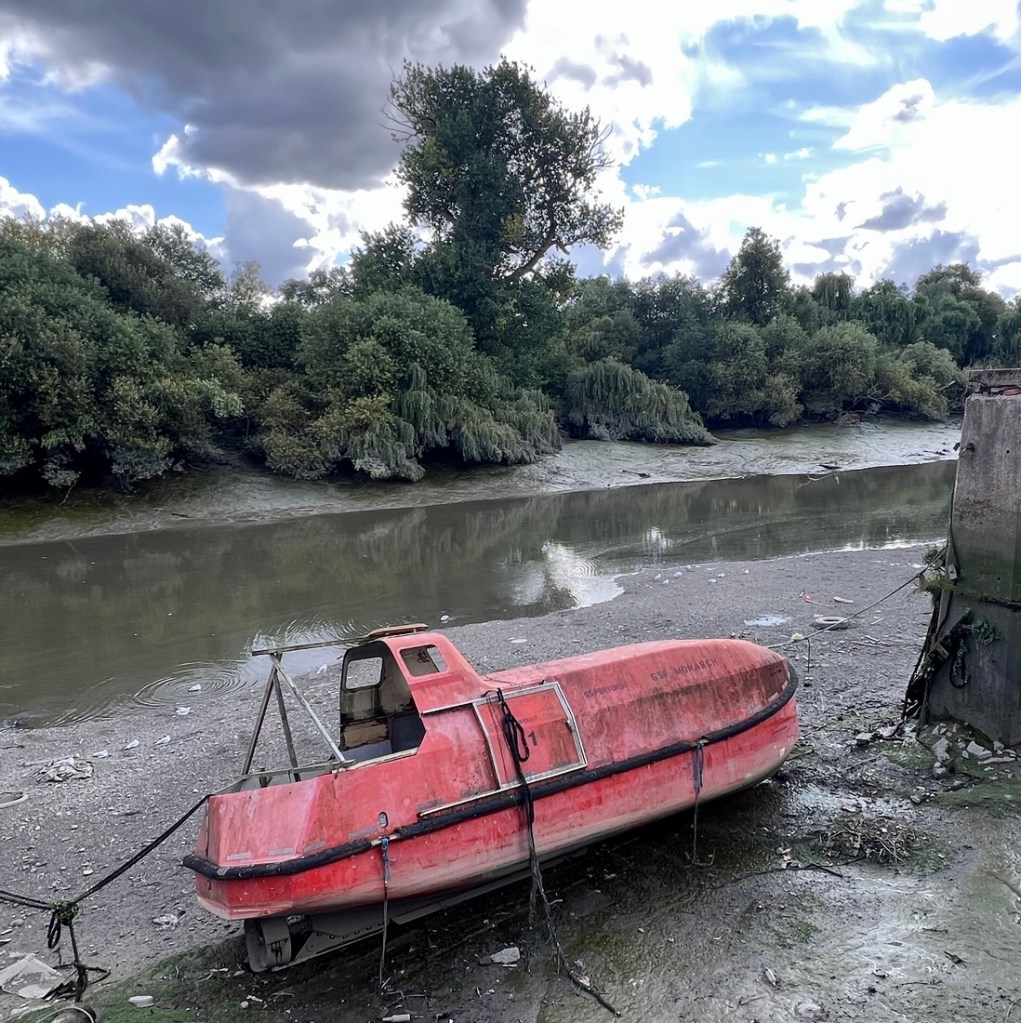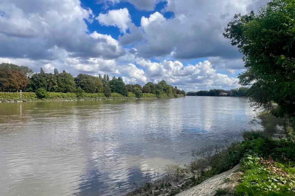 I had expected this to be very similar to the previous day but it was surprisingly different. On the downside, a collapsed path by Kew Gardens forced a detour on the north bank which added a mile, making it about a 13-mile day. On the plus side, the impact of tides on the the Thames below Teddington Lock made the river different from what we’d seen, and our walking it between low tide and high tide emphasized the 15-foot tidal range as we watched lots of rowing boats whizz by.