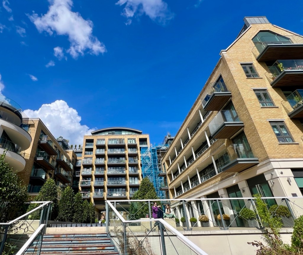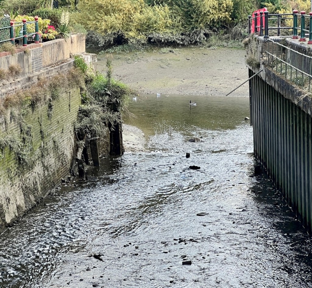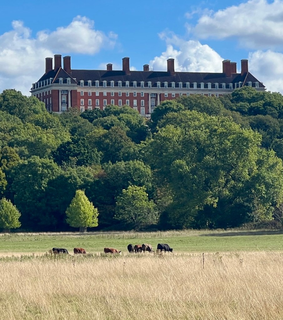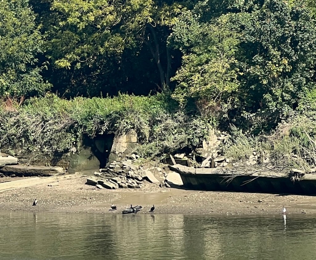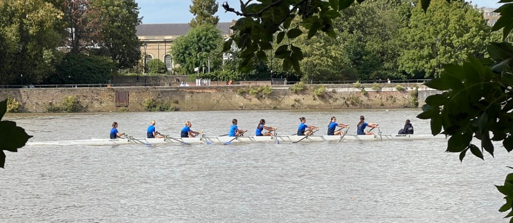 I had expected this to be very similar to the previous day but it was surprisingly different. On the downside, a collapsed path by Kew Gardens forced a detour on the north bank which added a mile, making it about a 13-mile day. On the plus side, the impact of tides on the the Thames below Teddington Lock made the river different from what we’d seen, and our walking it between low tide and high tide emphasized the 15-foot tidal range as we watched lots of rowing boats whizz by.