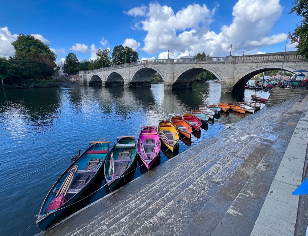 We approached Richmond.A large building on the top of Richmond Hill, looking down on cows that I was surprised to see so close to central London.Eric walked down these steps to highlight the tidal range. The high tide mark was this side of the white posts, maybe ten feet above the current water level.As we walked carefully along the towpath that was a bit muddy from high tide, we spotted Richmond Bridge, which was built in the 1700s.Colorful boats by Richmond Bridge, and right next to my planned tea break.