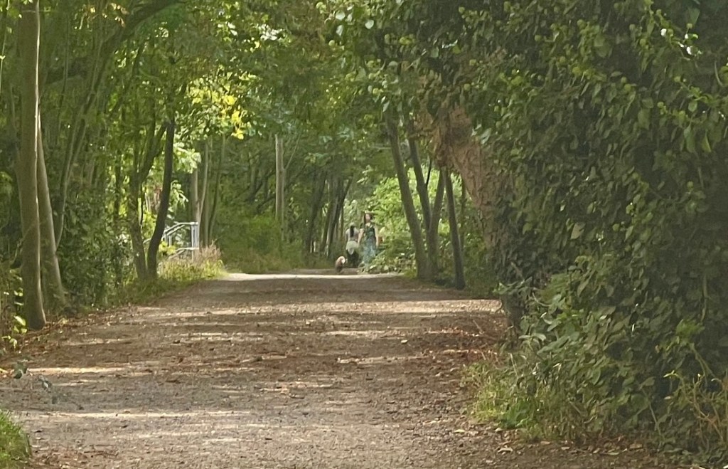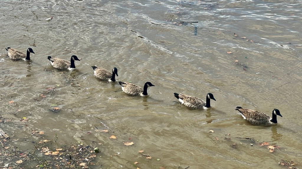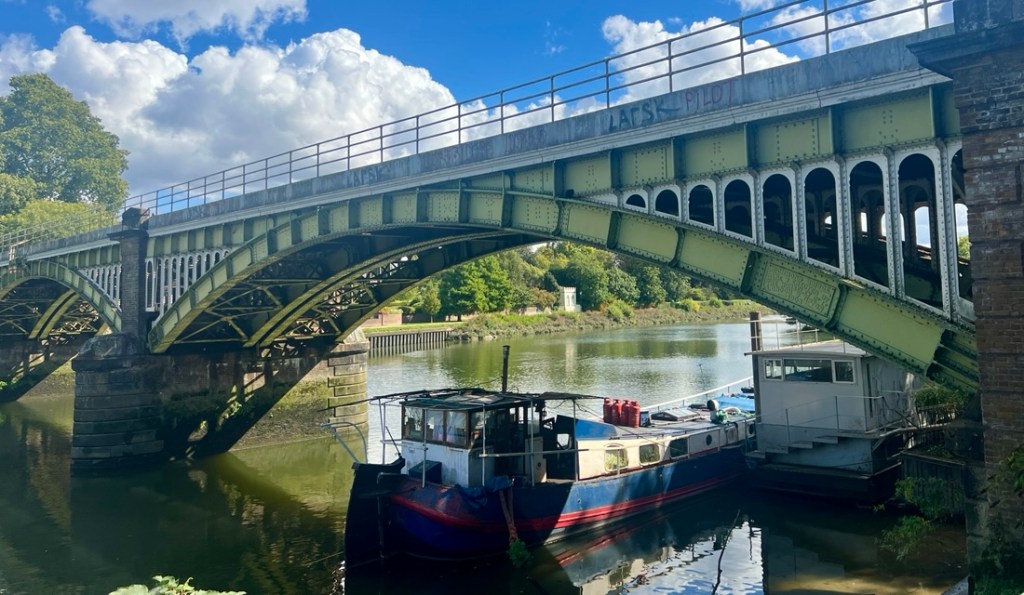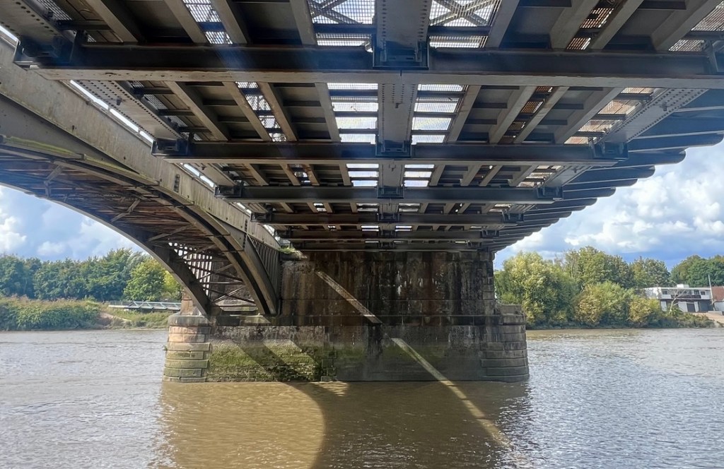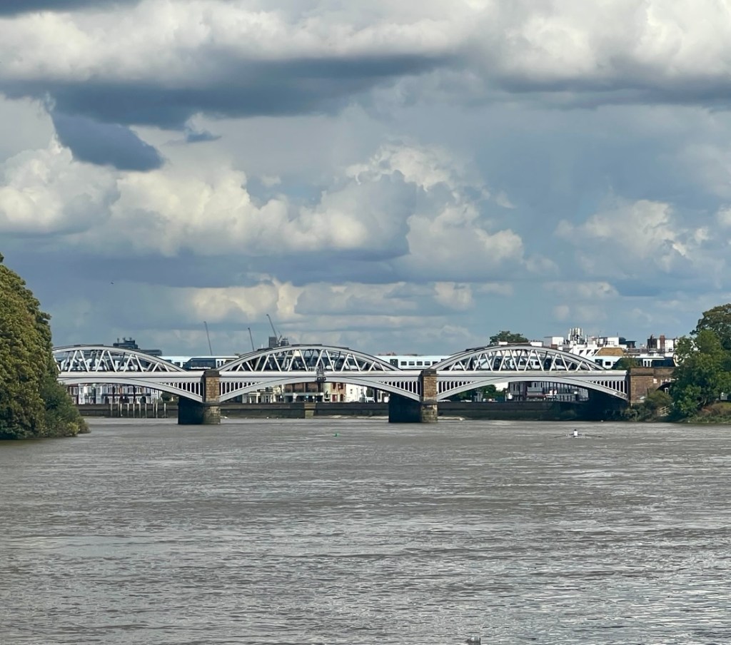 At times, we walked in a green tunnel, but the river was right there.We enjoyed apples that someone was giving away.Chiswick Bridge from upstream of it.This section of river is the end of the Oxford Cambridge Boat Race.The Boat Race’s finish line just below Chiswick Bridge.The tow path had flooded at the recent high tide.Avoiding the mud!Barnes Railway Bridge looked impressive.Underneath Barnes Railway Bridge.After Barnes Railway Bridge, the vibe turned distinctly suburban.My geese were in a row again!
