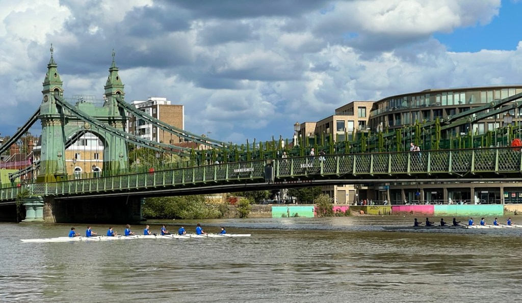 Two eights pass under Hammersmith Bridge.A cool perspective of Hammersmith Bridge.