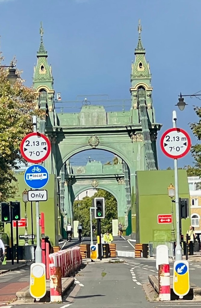 We saw some eights rowing, and it was particularly fun watching a pair of them race under Hammersmith Bridge. The rest of our gang was pleased as this is where we turned off the trail for a short walk to our hotel for the night – another The Bridge.