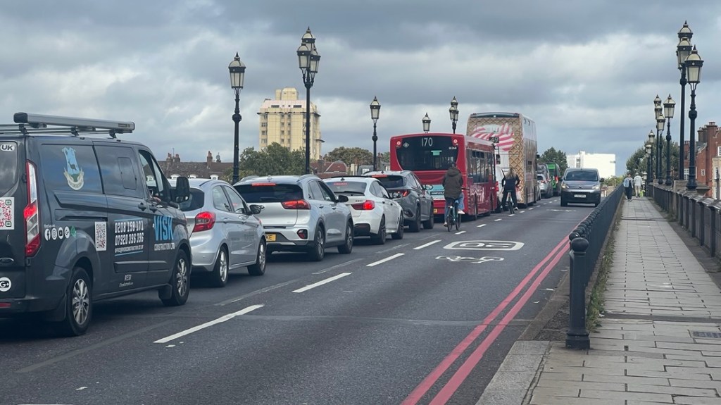 Buses lining up on Putney Bridge, where the Oxford Cambridge Boat Race starts.