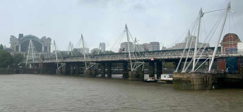 The Hungerford Railway Bridge taking trains into Charring Cross. Pedestrian bridges were added to it for the queen’s golden jubilee.