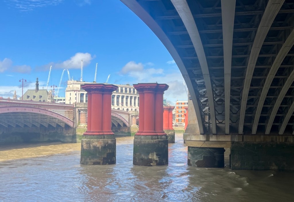 Underneath Blackfriars Railway Bridge, looking at the road bridge and the pillars from the former railway bridge.