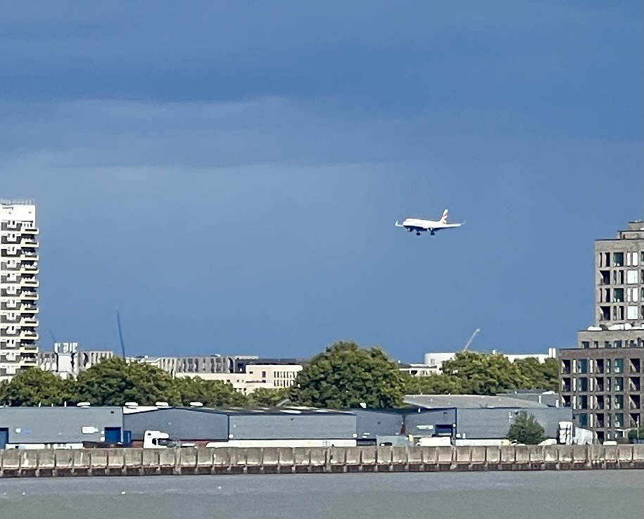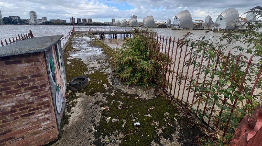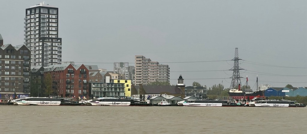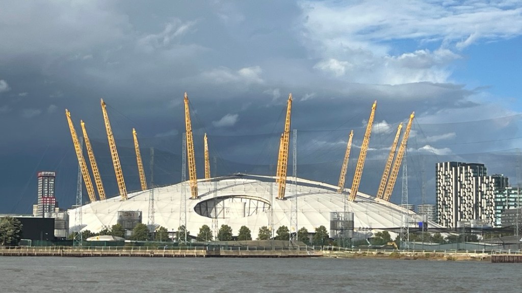 Ever since I saw this Bond film, I wanted to visit the O2 arena, which was built for a millennial exhibition in 1999.The sky was very dark over the gondola.More fancy flats and some radar! I’m not sure I’d like that outside my bedroom window.This pier served a Cemex cement plant.Much of this area was quite run down, like this Thames Path information board which was unreadable.Much of the river frontage was aggregate plants. This closed pub had run out of hope.I could smell the bitumen from this Tarmac plant.The Thames Barrier was cool, made cooler by watching planes take off from London City Airport.This abandoned dock by the Thames Barrier had trees growing out of it.The upstream side of the Thames Barrier.A barrier in a raised position. A derelict warehouse.Some billboards celebrated this area’s history, which including making Siemen’s batteries.Another plane landing at City Airport.The river kept getting wider but the path remained wide, flat, and clear.The view back to Canary Wharf.Yay! I arrived at Woolwich, the end of the Thames Path. I wasn’t sure what these sculptures were.There was no sign declaring this as the end of the path. An extension to the coast has been made, but that would have to wait for another day.As the path ended next to this pier, I could conveniently take a boat back to Greenwich where our hotel was.As I was downstream of the barrier, boats don’t run this far when the barrier is closed. It had been closed earlier this week during the very high tides, which we experienced with wet tow paths.This felt more like a working river.My Uber boat arrived.The boat whizzed along. It was impressive how quickly it accelerated and stopped. New fancy flats next to a car ferry that crossed the Thames.Passing through the Thames Barrier.An aggregate plant and a rubbish barge alongside some flats. Interesting blending.A great view of the O2 from the river.